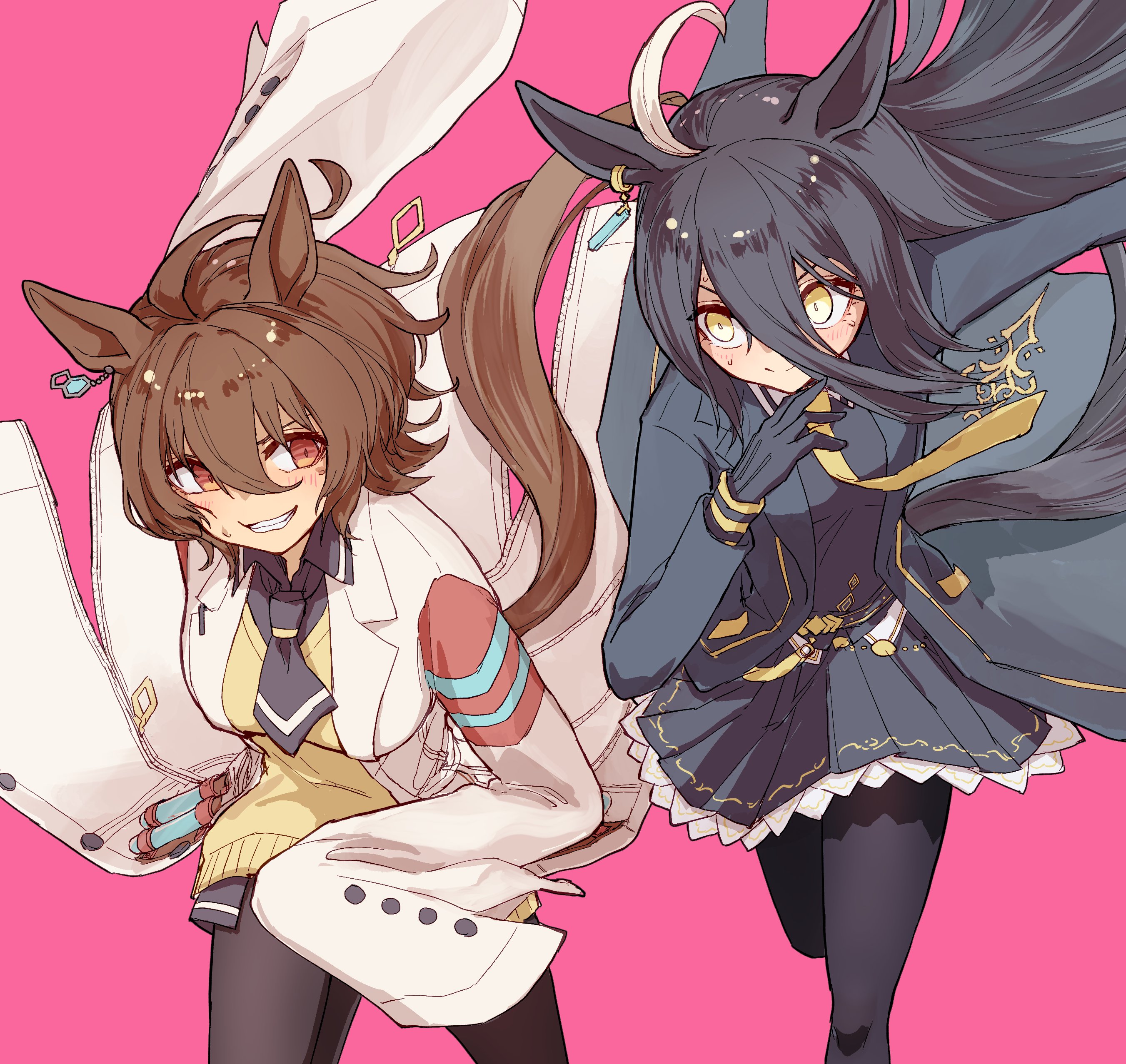 absurdres agnes_tachyon_(tach-nology)_(umamusume) agnes_tachyon_(umamusume) ahoge animal_ears bad_id bad_twitter_id black_hair brown_eyes commentary_request grin hair_between_eyes highres horse_ears horse_tail lab_coat long_hair long_sleeves looking_at_another manhattan_cafe_(umamusume) pantyhose pink_background running short_hair smile tail umamusume yellow_eyes yomogi_(bread)