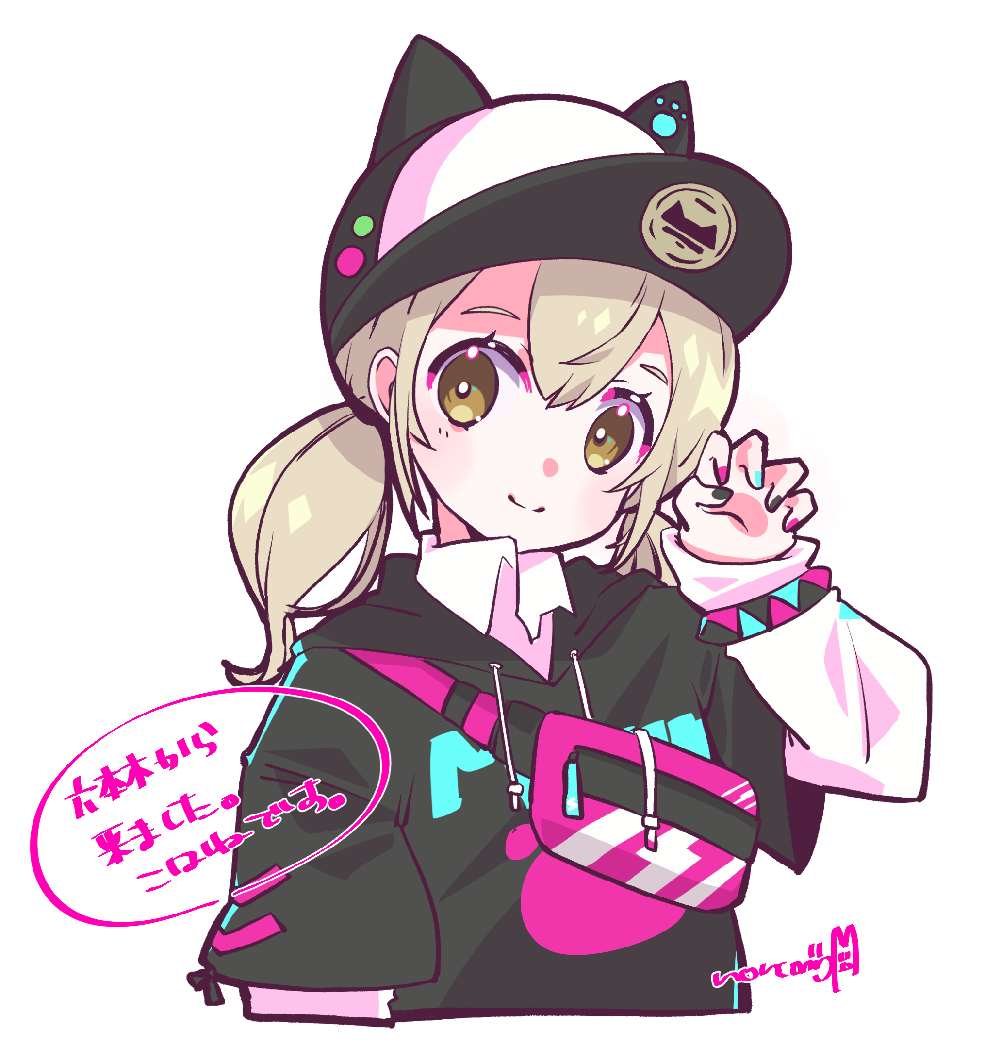 1girl animal_ears animal_hat azusawa_kohane baseball_cap blonde_hair cat_ears cat_hat collared_shirt cosplay costume_switch crossover denonbu fake_animal_ears fanny_pack hair_ornament hat highres hood kurogane_tama long_sleeves looking_at_viewer nail_polish nonkomu_(furiten5553) paw_print poncho project_sekai shirt short_twintails smile twintails voice_actor_connection white_shirt yellow_eyes