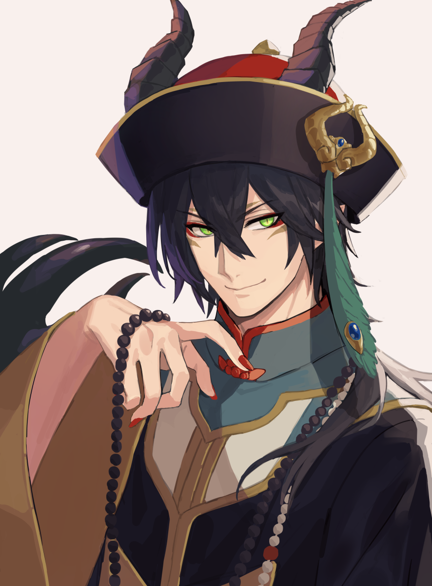 1boy bad_link beads black_hair chorefuji closed_mouth commentary_request green_eyes hair_between_eyes hand_up hat hat_ornament highres horns looking_at_viewer male_focus malleus_draconia malleus_draconia_(halloween) nail_polish red_nails short_hair simple_background smile solo turtleneck twisted_wonderland upper_body white_background