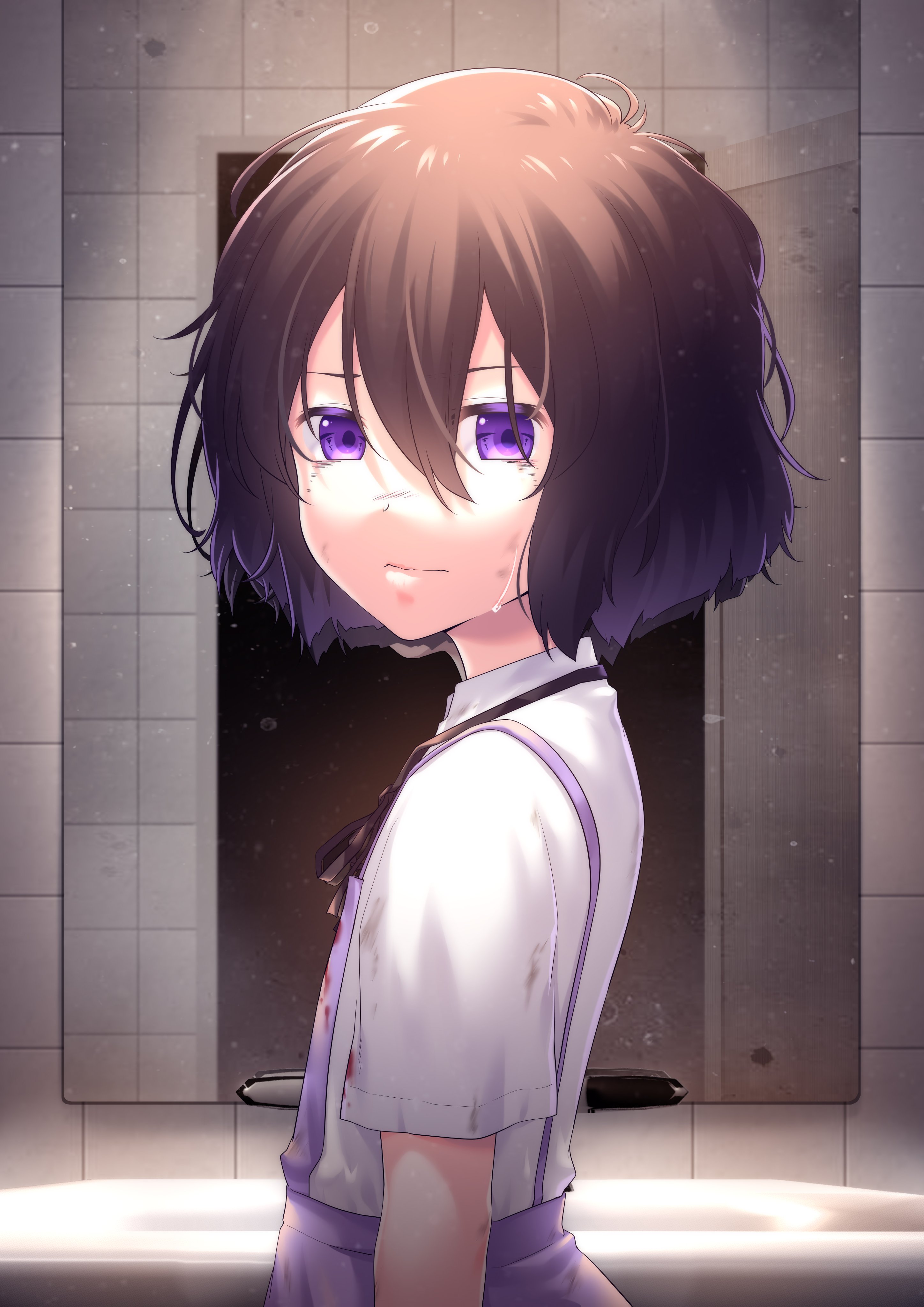 1girl absurdres black_hair blood blood_on_clothes brown_hair hair_between_eyes highres levana_violette_(lusan666) looking_back lusan666 mirror multicolored_hair original overalls purple_eyes purple_overalls shirt short_hair short_sleeves solo white_shirt