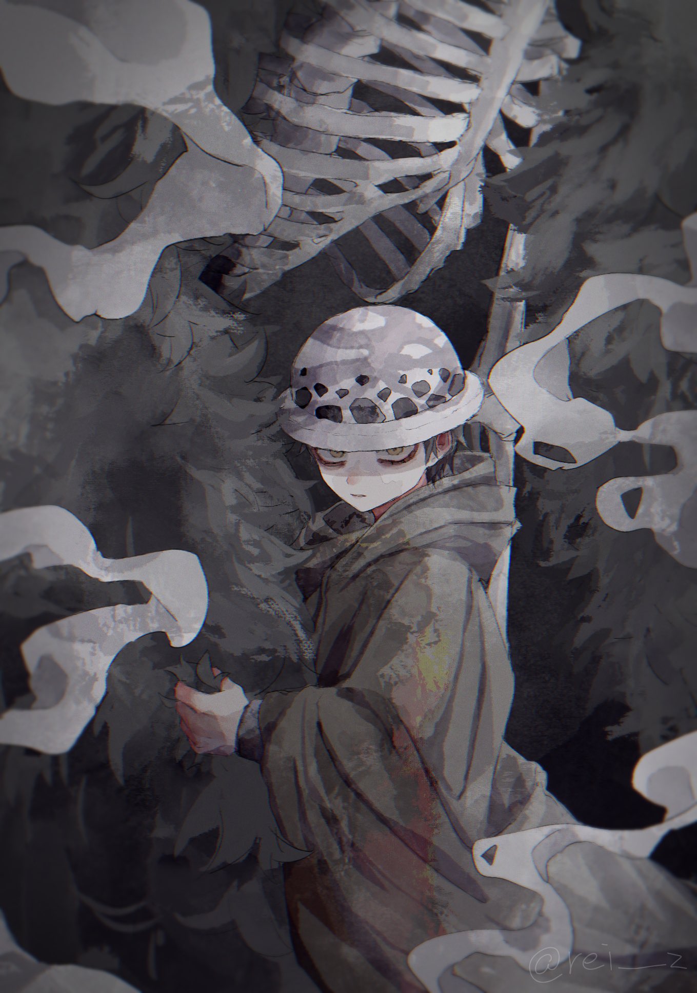 1boy aged_down bags_under_eyes black_feathers black_hair child cloak donquixote_rocinante expressionless feather_boa feathers grey_cloak hat highres holding holding_feather long_sleeves male_focus muted_color one_piece pale_skin rei_su ribs short_hair skeleton smoke solo trafalgar_law twitter_username yellow_eyes