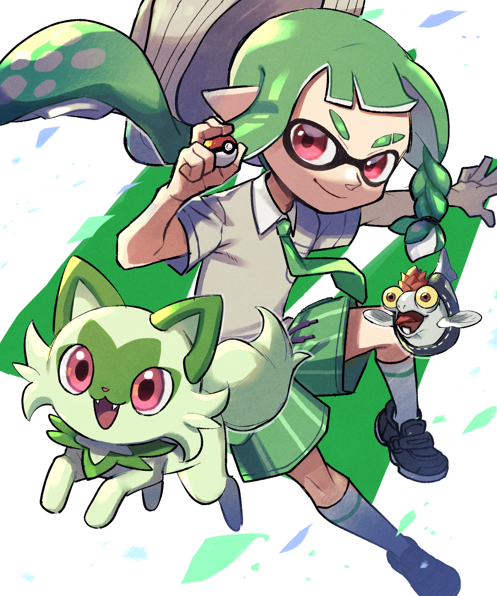 1girl asymmetrical_hair black_footwear braid breast_pocket closed_mouth collared_shirt eyebrow_cut green_hair green_necktie green_shorts hat highres holding holding_poke_ball inkling inkling_girl inkling_player_character kneehighs long_hair naranja_academy_school_uniform necktie nintendo pink_eyes pocket pointy_ears poke_ball poke_ball_(basic) pokemon pokemon_(creature) pokemon_sv salmonid school_uniform shida556 shirt shoes short_sleeves shorts single_horizontal_stripe smallfry_(splatoon) smile socks splatoon_(series) splatoon_3 sprigatito striped_clothes striped_shorts suction_cups tentacle_hair vertical-striped_clothes vertical-striped_shorts white_headwear white_shirt white_socks