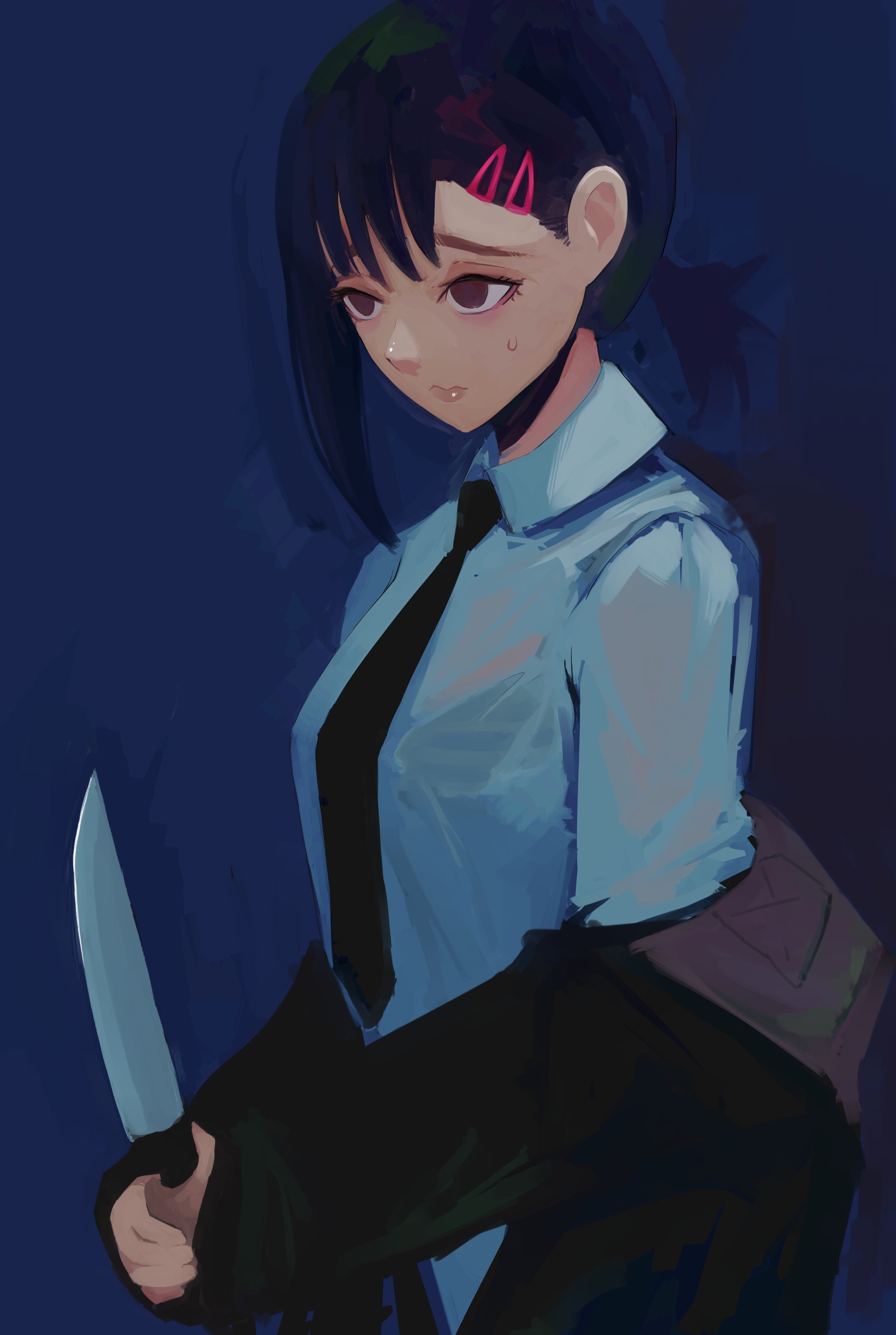 1girl absurdres black_hair black_jacket black_necktie blue_background brown_eyes chainsaw_man closed_mouth collared_shirt commentary english_commentary hair_ornament hairclip higashiyama_kobeni highres holding holding_knife jacket jacket_partially_removed knife necktie pea_(poopingirl) shirt simple_background solo suit_jacket sweatdrop white_shirt