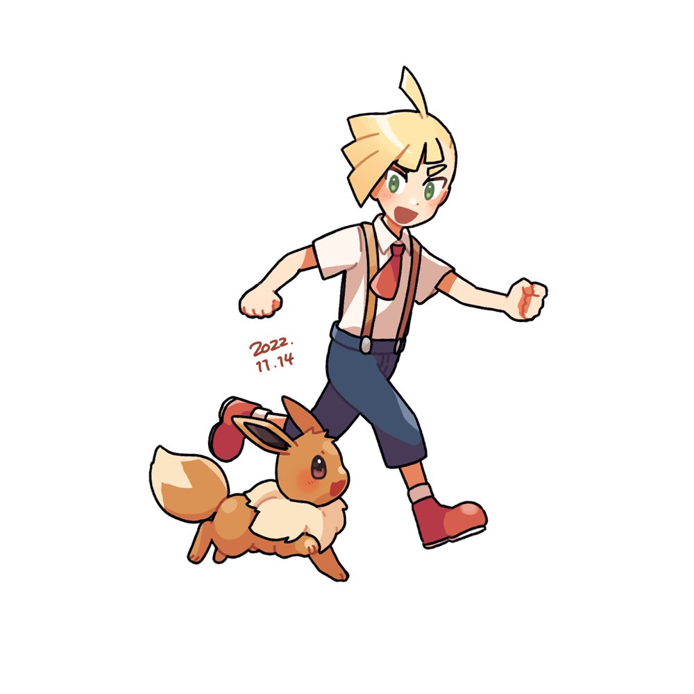 1boy :d aged_down ahoge blonde_hair blush capri_pants clenched_hands collared_shirt commentary_request daifuku_(pokefuka_art) dated eevee gen_1_pokemon gladion_(pokemon) green_eyes male_focus necktie nintendo open_mouth pants pokemon pokemon_(anime) pokemon_(creature) pokemon_the_series:_sun_&_moon shirt shoes short_hair short_necktie short_sleeves simple_background smile suspenders white_background white_shirt