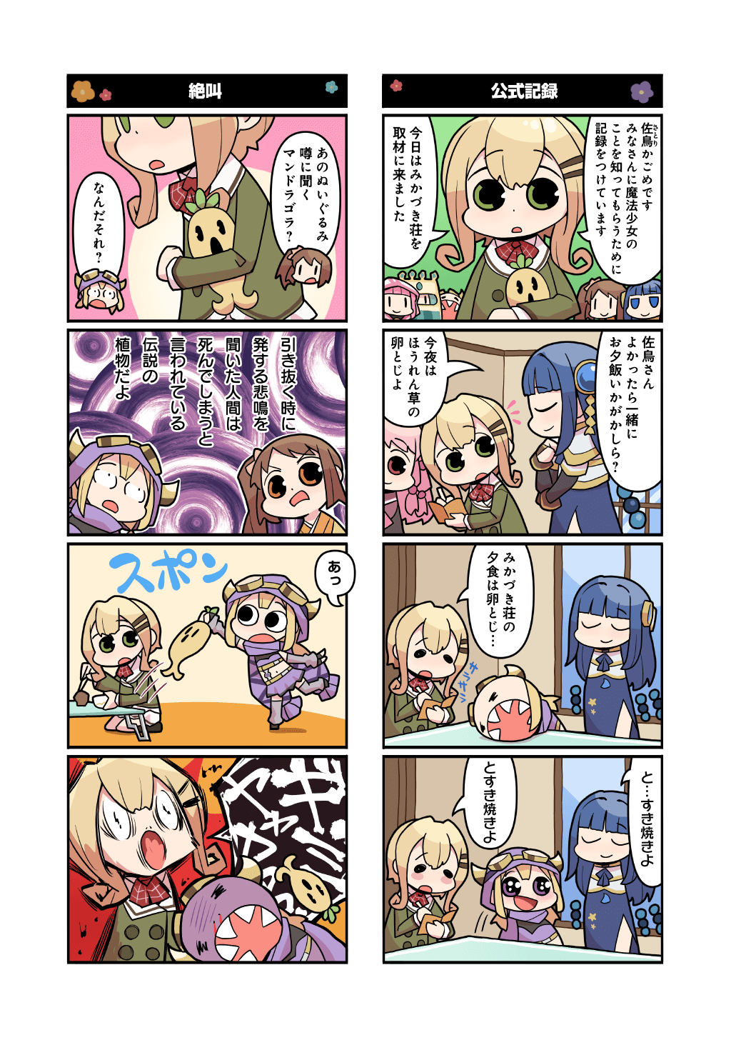 4koma 6+girls :d =_= arm_warmers armor blazer blonde_hair blue_dress blue_eyes blue_hair blunt_bangs bow bowtie breastplate brown_hair buttons chibi closed_eyes closed_mouth comic crop_top curly_hair detached_sleeves dot_nose dress fake_horns fingerless_gloves futaba_sana gloves goggles goggles_on_headwear green_eyes green_jacket hair_between_eyes hair_ornament hairclip headdress highres horns jacket leg_warmers long_sleeves looking_at_another magia_record:_mahou_shoujo_madoka_magica_gaiden magical_girl mahou_shoujo_madoka_magica miniskirt mitsuki_felicia multi-tied_hair multiple_4koma multiple_girls nanami_yachiyo navel no_nose official_art open_mouth orange_eyes outline papa_(shimeguru) parted_lips pink_hair plaid_bow plaid_bowtie plaid_clothes purple_hood purple_scarf purple_shirt purple_skirt purple_sleeves purple_thighhighs red_bow red_bowtie satori_kagome scarf school_uniform screaming shield shirt side_ponytail side_slit sidelocks skirt smile solid_oval_eyes speech_bubble stuffed_toy swept_bangs tamaki_iroha tamaki_ui thighhighs white_armor white_outline white_skirt yui_tsuruno |_|