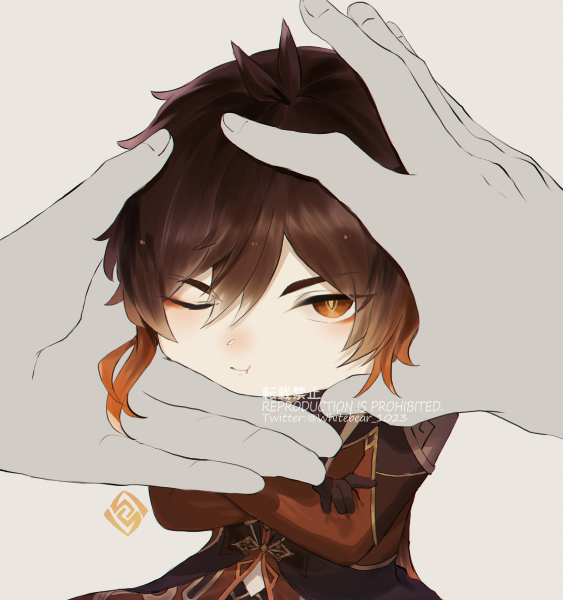 1boy antenna_hair brown_hair closed_mouth commentary_request crossed_arms diamond-shaped_pupils diamond_(shape) disembodied_hand genshin_impact long_sleeves looking_at_viewer male_focus one_eye_closed orange_eyes pout solo squishing symbol-shaped_pupils vision_(genshin_impact) whitebear_1023