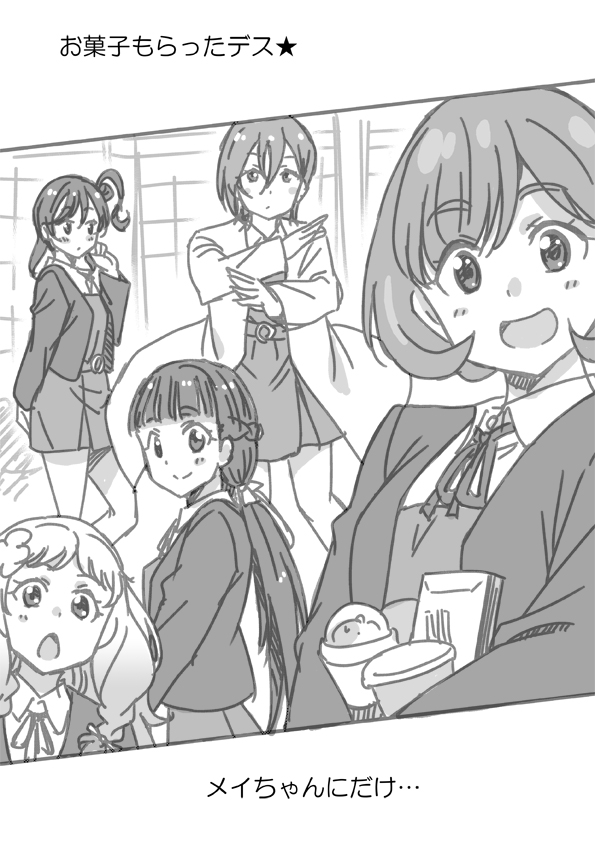 5girls :d arm_behind_back arm_up blunt_bangs blush braid flower food greyscale hair_between_eyes hair_bun hair_flower hair_ornament hair_ribbon holding holding_food lab_coat long_hair looking_at_viewer love_live! love_live!_superstar!! low_twintails marugoshi_teppei medium_hair monochrome multiple_girls narration one_side_up onitsuka_natsumi open_mouth photo_(object) ribbon sakurakoji_kinako school_uniform short_hair side_braids single_side_bun smile star_(symbol) tang_keke twintails unfinished sketch_background wakana_shiki yoneme_mei yuigaoka_school_uniform