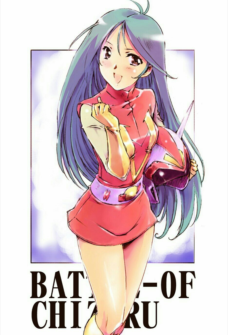 1girl :d belt blue_hair breasts brown_eyes choudenji_robo_combattler_v cowboy_shot dress gloves hair_behind_ear head_tilt unworn_headwear helmet unworn_helmet highres long_hair moriguchi_nao_(naonao) nanbara_chizuru open_mouth panties purple_belt red_dress small_breasts smile solo underwear very_long_hair yellow_gloves yellow_panties