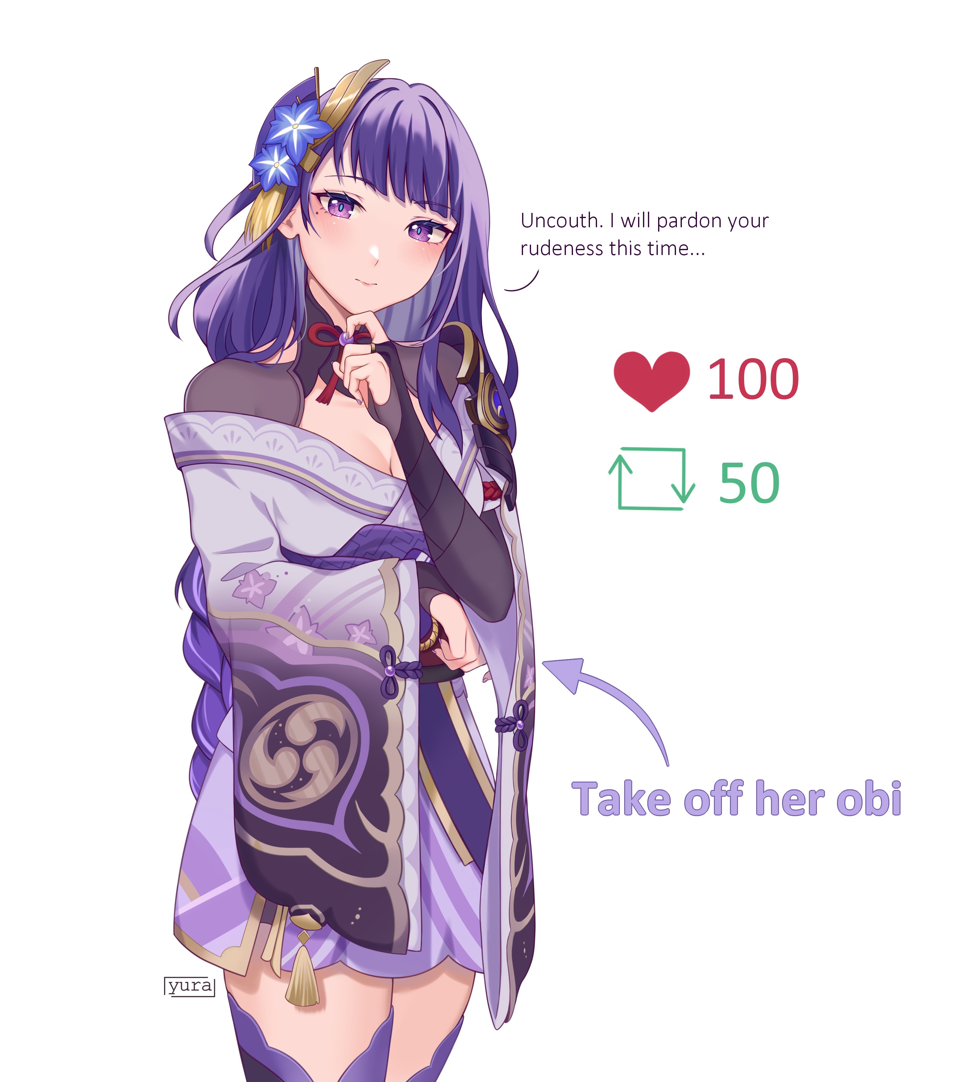 1girl absurdres armor blush braid breasts bridal_gauntlets english_text flower genshin_impact hair_flower hair_ornament highres japanese_clothes kimono like_and_retweet long_hair looking_at_viewer low-braided_long_hair low-tied_long_hair medium_breasts obi purple_eyes purple_hair purple_kimono raiden_shogun sash shoulder_armor smile solo tassel thighhighs twitter_strip_game very_long_hair yura_s_arts