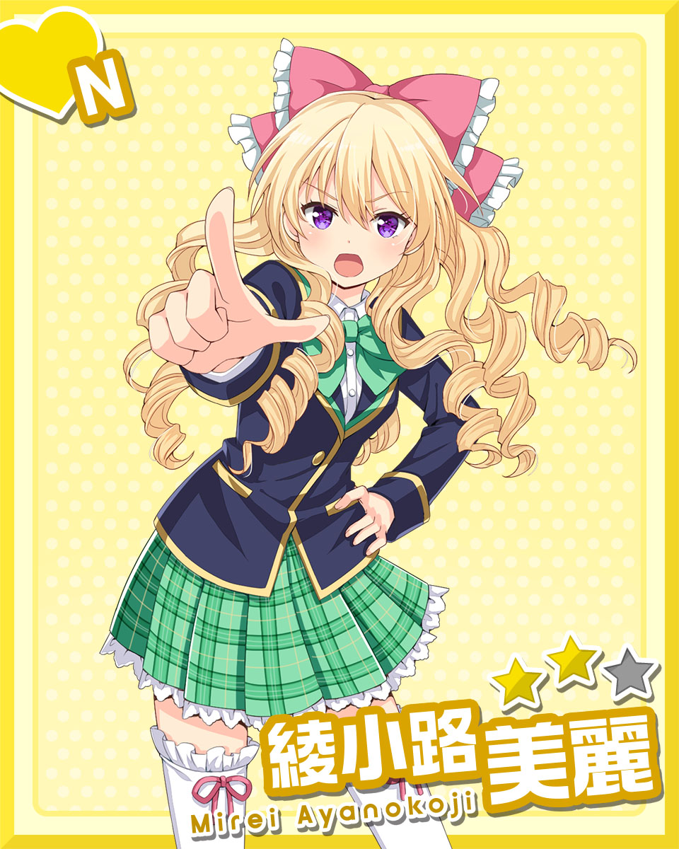 1girl ayanokoji_mirei blonde_hair blue_jacket bow card character_name drill_hair frills girlfriend_(kari) green_bow green_skirt highres jacket official_art open_mouth pink_bow plaid_clothes plaid_skirt purple_eyes qp:flapper ringlets school_uniform skirt thighhighs yellow_background