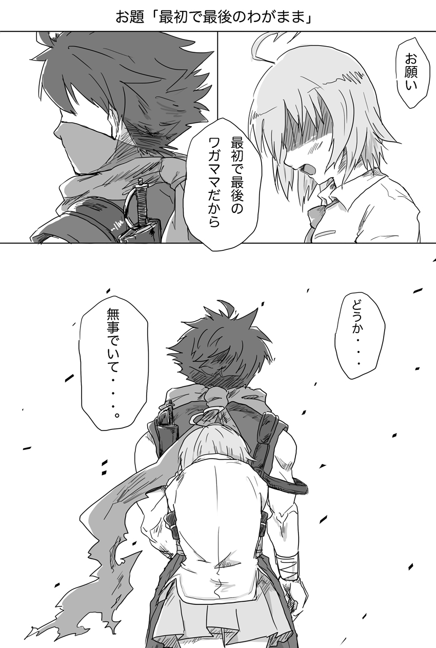 1boy 1girl aino_heart arcana_heart crossover height_difference highres hug hug_from_behind japanese_text legs necktie ninja open_mouth school_uniform shaded_face short_hair skirt spiked_hair strider_hiryuu thighs tongue translation_request