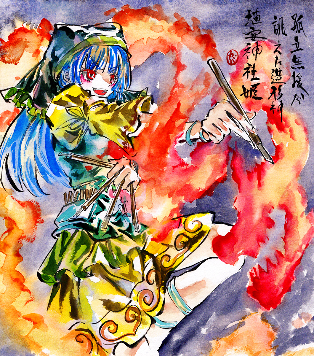 1girl :d apron between_fingers blue_hair calligraphy commentary_request dragon dress evil_smile fire green_apron green_headscarf green_headwear haniyasushin_keiki headscarf highres holding kabaji knee_up long_hair open_mouth outstretched_arm painting_(medium) pliers puffy_sleeves red_eyes shikishi smile solo tools touhou traditional_media v-shaped_eyebrows watercolor_(medium) yellow_dress
