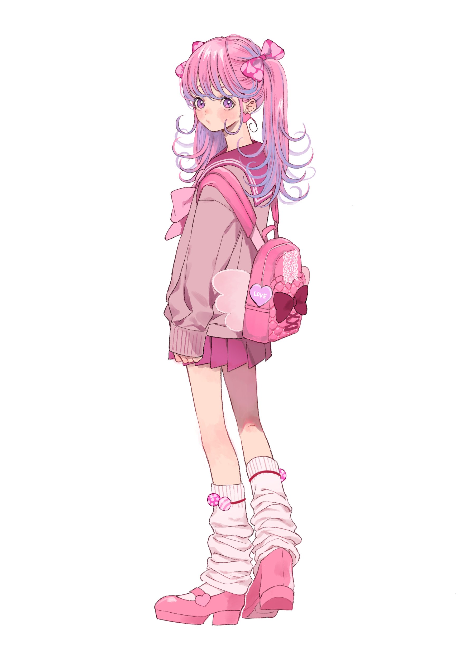 1girl absurdres backpack bag bow bowtie full_body gradient_hair hair_bow highres long_hair looking_at_viewer loose_socks multicolored_hair original pink_bow pink_hair pink_shoes pleated_skirt purple_hair red_skirt sailor_collar school_uniform serafuku shoes simple_background skirt socks solo twintails twintails_day wata_kinoshi white_background winged_bag