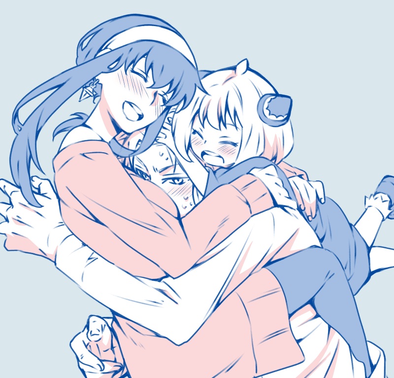 1boy 2girls adoptive_parent_and_adoptive_child anya_(spy_x_family) blush breast_smother child closed_eyes drunk earrings face_to_breasts family father_and_child father_and_daughter hairpods happy hug husband_and_wife jewelry kamimiya long_hair long_sleeves mother_and_child mother_and_daughter multiple_girls off-shoulder_sweater off_shoulder open_mouth parent_and_child sidelocks spy_x_family sweatdrop sweater twilight_(spy_x_family) yor_briar