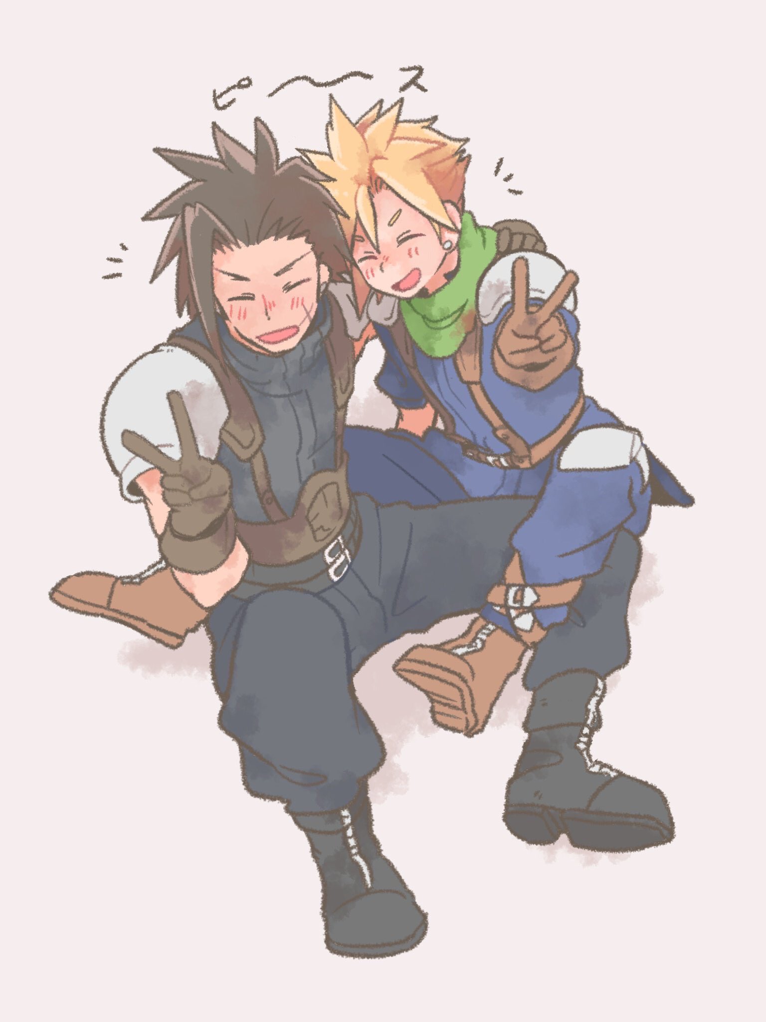 2boys armor black_hair blonde_hair blush boots brown_gloves closed_eyes cloud_strife crisis_core:_final_fantasy_vii earrings facial_scar final_fantasy final_fantasy_vii full_body gloves green_scarf highres jewelry multiple_boys open_mouth scar scar_on_cheek scar_on_face scarf shinra_infantry_uniform shoulder_armor simple_background sitting smile spiked_hair square_enix sweater tasituma2 turtleneck turtleneck_sweater v zack_fair