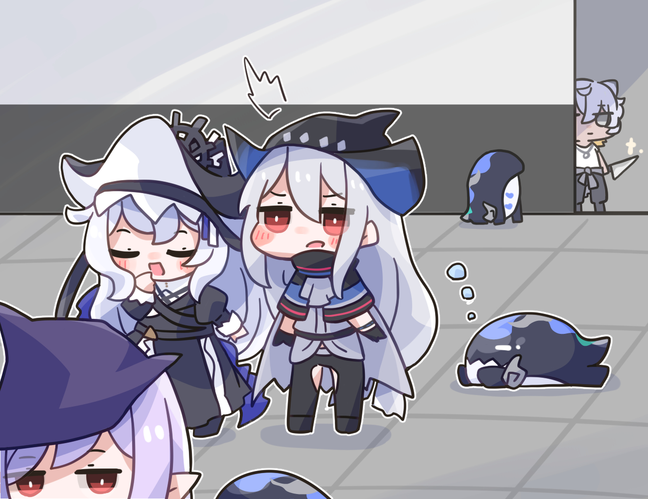 :d ^^^ arknights black_capelet black_dress black_headwear black_pants blush_stickers capelet chibi closed_eyes clothing_cutout commentary_request crotch_cutout dress gladiia_(arknights) grey_eyes grey_hair grey_shirt hair_between_eyes hat holding holding_knife indoors jaye_(arknights) knife midzuchi open_mouth pants pointy_ears purple_hair red_eyes shirt skadi_(arknights) smile specter_(arknights) standing tile_floor tiles