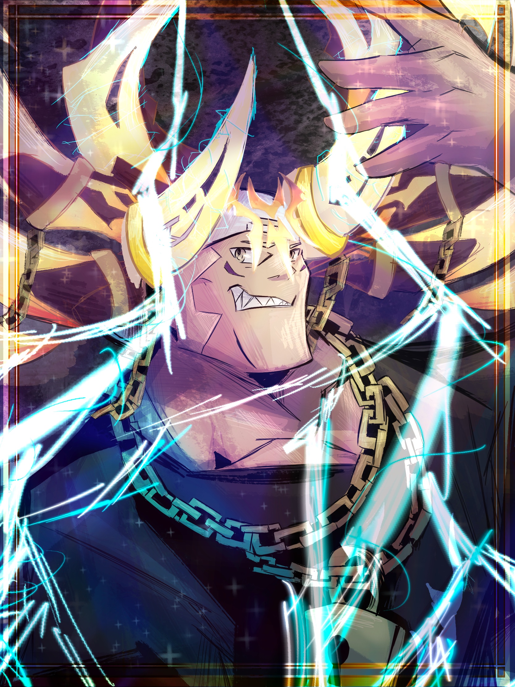 1boy backwards_hat baseball_cap black_shirt blonde_hair brown_eyes chain chain_necklace electricity grin hat highres horns jewelry lock male_focus necklace padlock padlocked_collar sharp_teeth shin_subarashiki_kono_sekai shirt sideburns sigil smile solo solo_focus subarashiki_kono_sekai susukichi_(ntwewy) tattoo teeth upper_body white_footwear