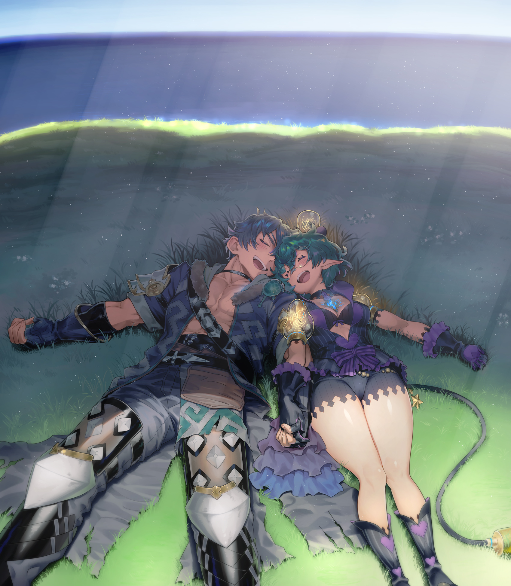 1boy 1girl :d abs armored_boots black_gloves blue_sky boots bra chest_jewel cloud cloudy_sky coat eyepatch fingerless_gloves gloves grass green_hair grey_coat grey_hair highres holding_hands jacket lying muscular muscular_male natto_soup on_back open_mouth outdoors pandoria_(xenoblade) purple_bra purple_footwear purple_gloves purple_jacket purple_shorts shadow short_hair short_sleeves shorts sky smile tail underwear xenoblade_chronicles_(series) xenoblade_chronicles_2 zeke_von_genbu_(xenoblade)