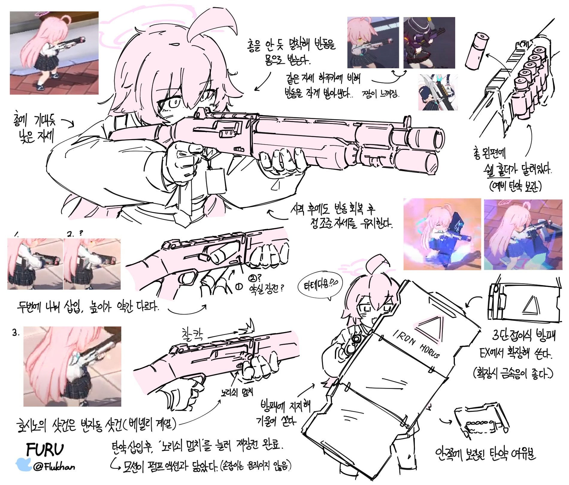 2girls ahoge ammunition ballistic_shield beretta_1301 blue_archive fabarm_fp6 flukhan game_screenshot gloves gun hair_between_eyes halo haruka_(blue_archive) highres holding holding_gun holding_weapon hoshino_(blue_archive) korean_text long_hair long_sleeves multiple_girls pump_action reference_inset shield shirt shotgun shotgun_shell simple_background skirt translation_request twitter_username weapon white_background