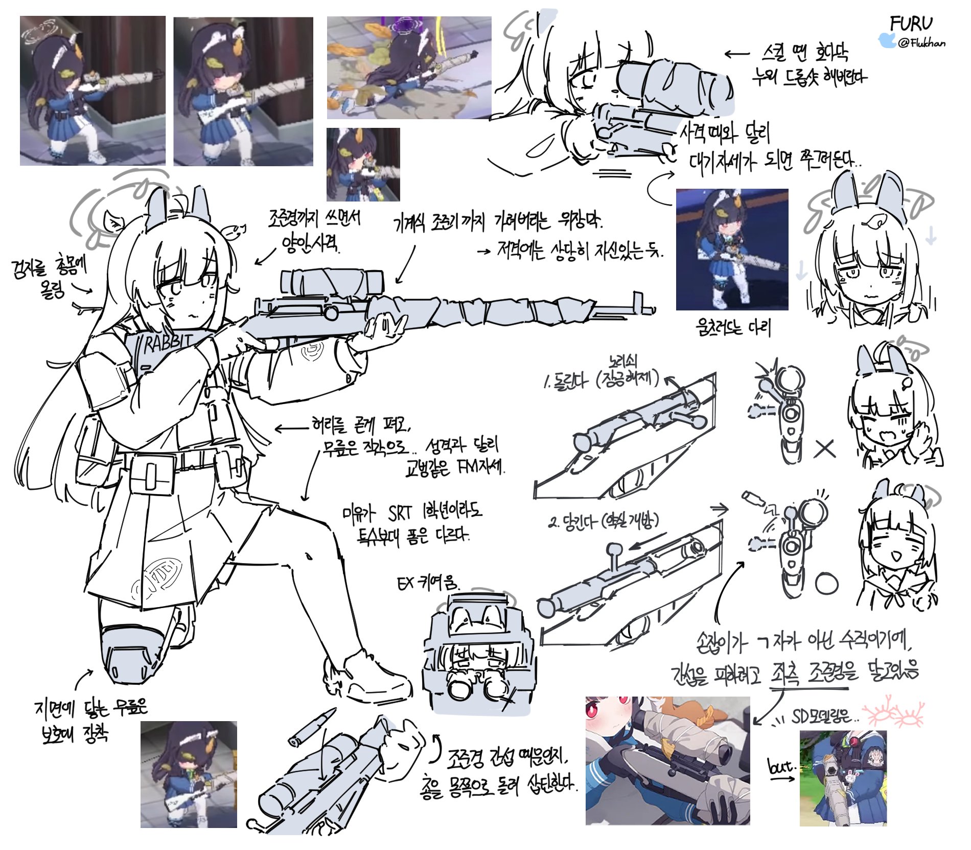 1girl aiming arrow_(symbol) binoculars blue_archive blunt_bangs bolt_action closed_eyes flukhan game_screenshot gun halo highres holding holding_gun holding_weapon knee_pads korean_text leaf leaf_on_head long_hair long_sleeves miyu_(blue_archive) mosin-nagant multiple_views on_one_knee pleated_skirt reference_inset rifle school_uniform simple_background single_knee_pad skirt translation_request twitter_username weapon white_background