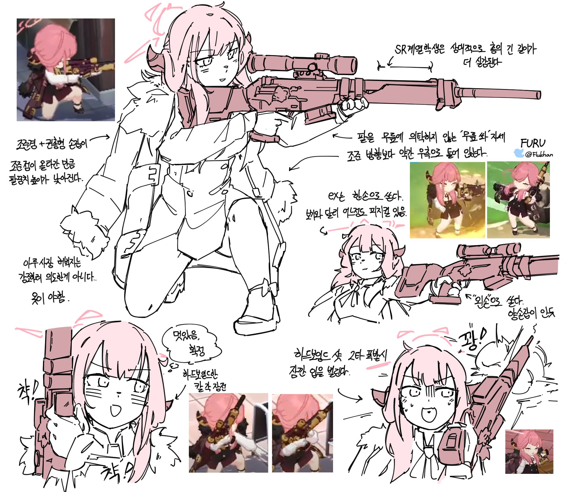 1girl aru_(blue_archive) blue_archive blush coat coat_on_shoulders flukhan fur-trimmed_coat fur_trim game_screenshot gun h&k_psg1 halo highres holding holding_gun holding_weapon horns jacket korean_text long_hair multiple_views on_one_knee open_mouth pink_hair reference_inset rifle simple_background skirt sniper_rifle sweat translation_request twitter_username weapon white_background