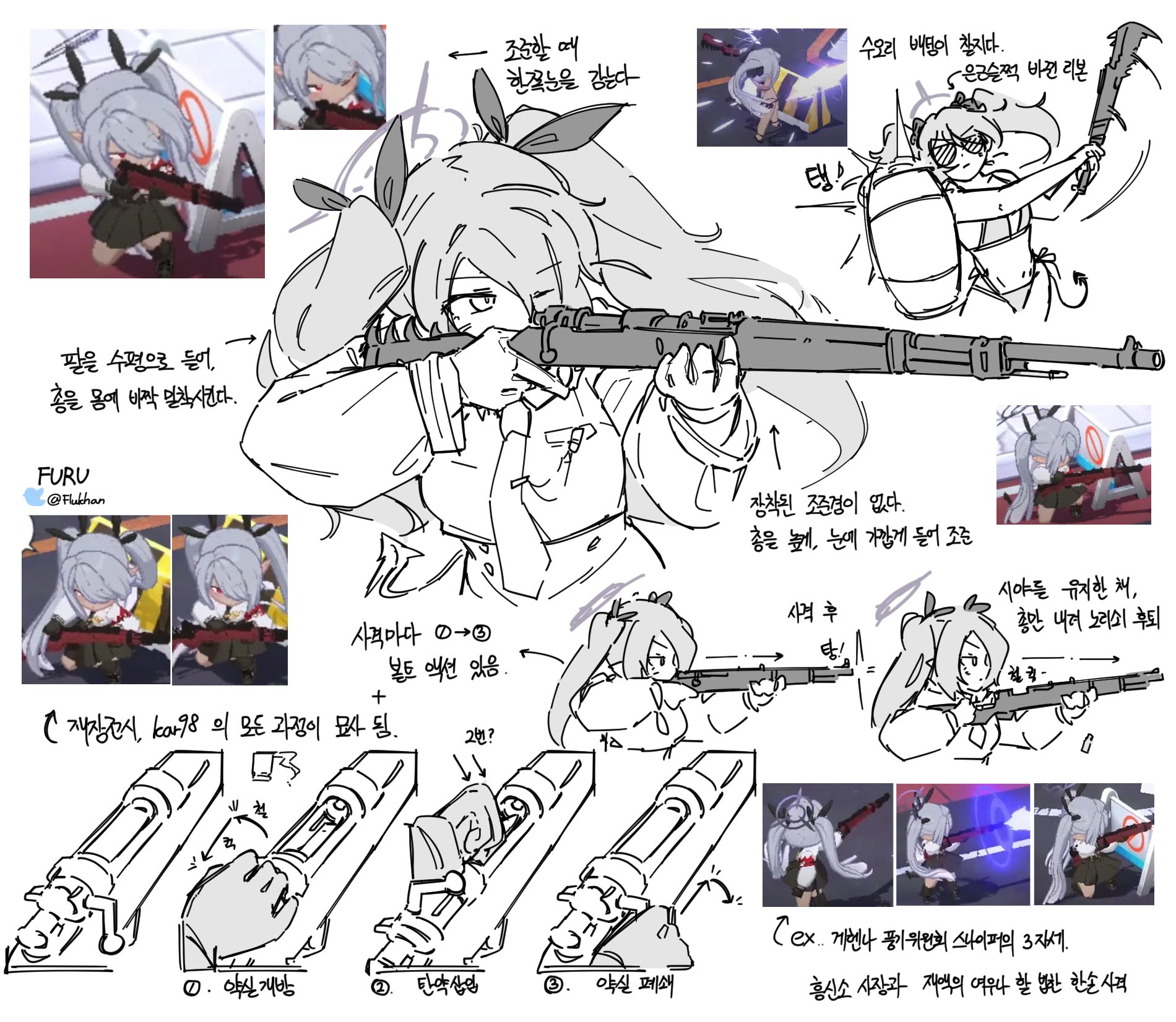1girl blue_archive bolt_action closed_mouth flukhan game_screenshot gloves gun hair_ribbon halo highres hitting holding holding_gun holding_weapon iori_(blue_archive) iori_(swimsuit)_(blue_archive) korean_text long_hair long_sleeves mauser_98 multiple_views necktie reference_inset ribbon rifle simple_background sunglasses translation_request twintails twitter_username weapon white_background
