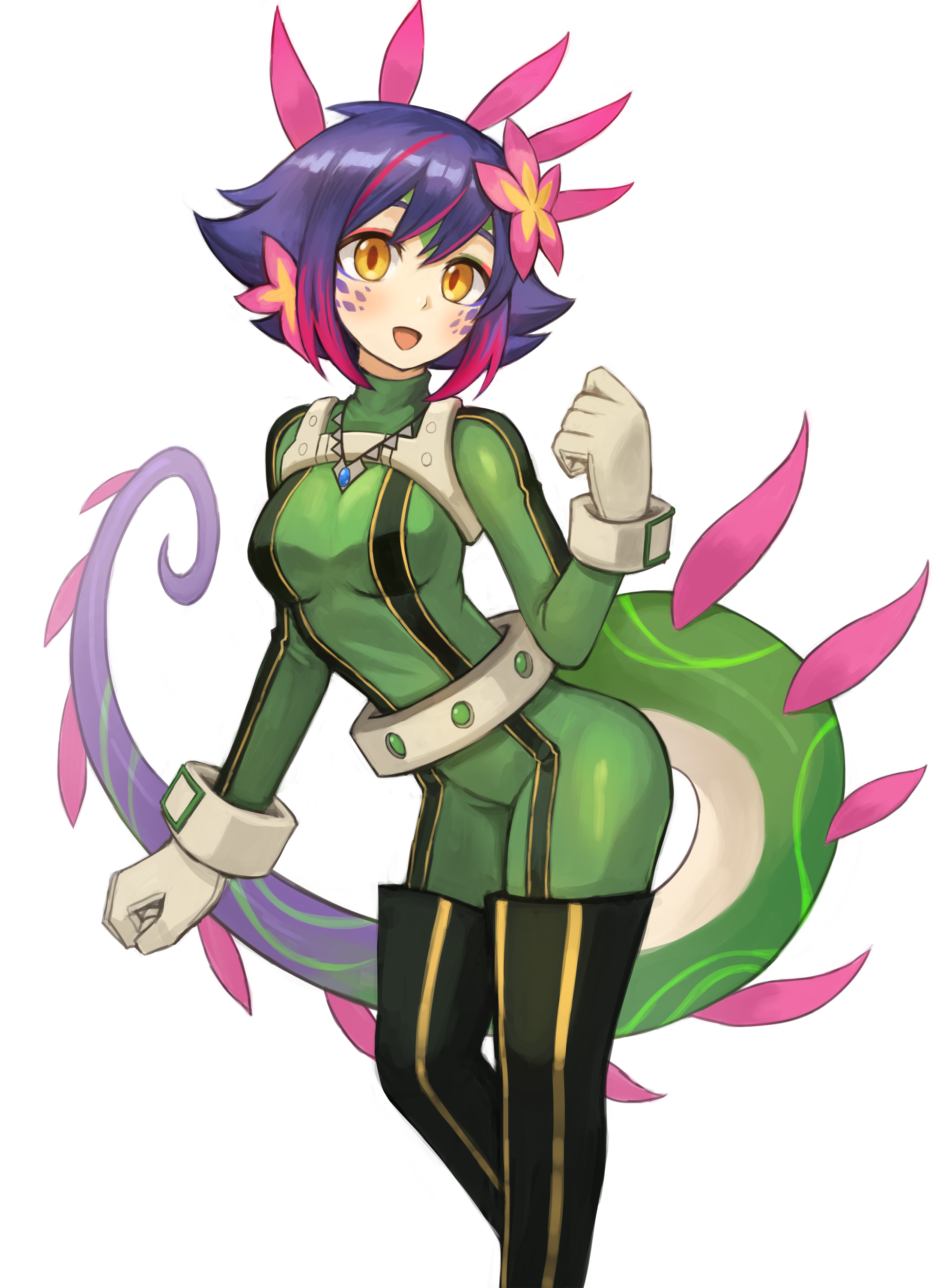 1girl :d absurdres asui_tsuyu asui_tsuyu_(cosplay) belt bodysuit boku_no_hero_academia brown_thighhighs clenched_hand commission cosplay feet_out_of_frame flower gloves green_bodysuit grey_belt hair_flower hair_ornament hand_up highres jewelry league_of_legends long_hair long_sleeves multicolored_hair necklace neeko_(league_of_legends) open_mouth pink_flower pixiv_commission purple_hair red_hair smile solo sookmo thighhighs two-tone_hair yellow_flower