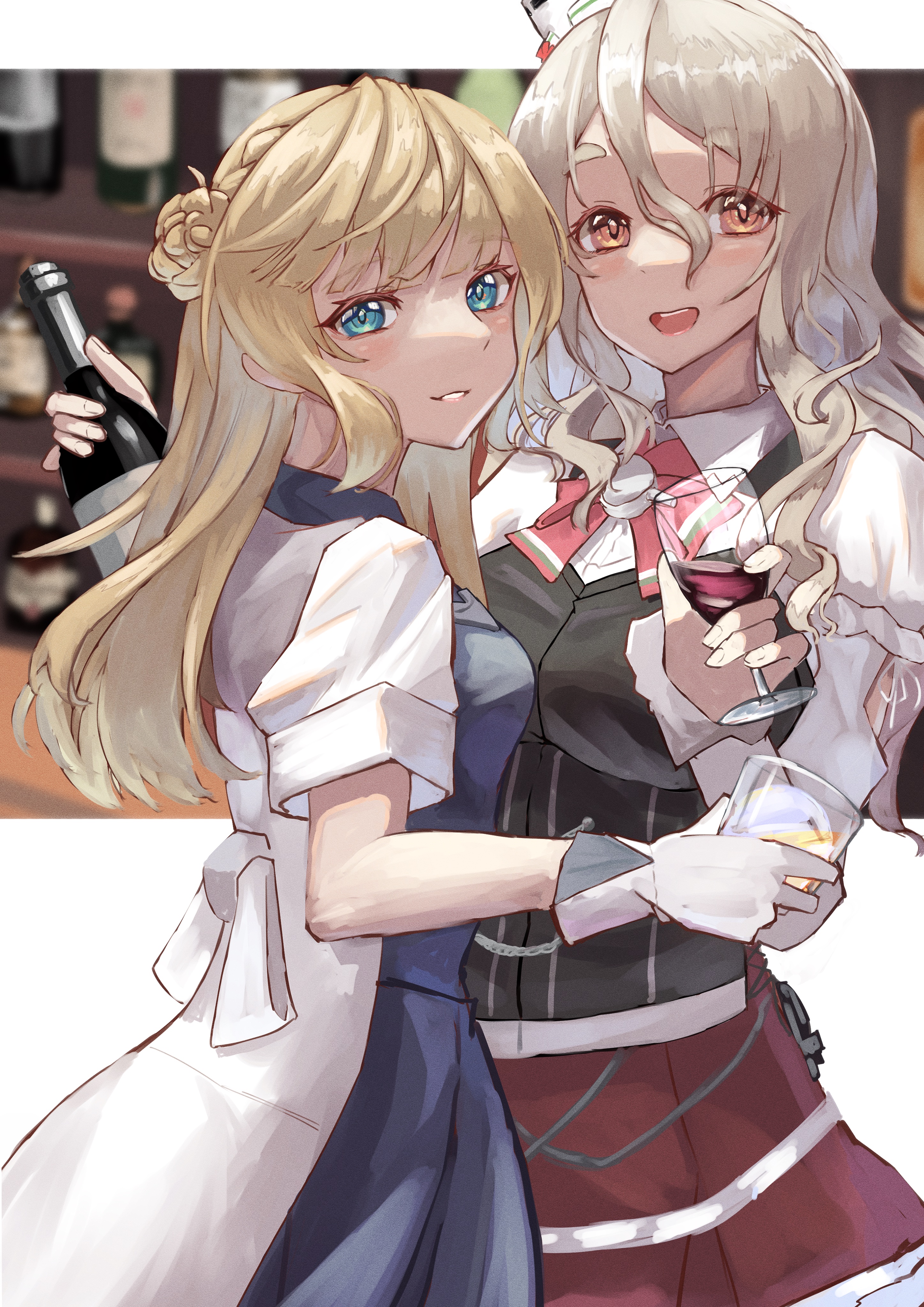 absurdres alcohol blue_eyes blue_necktie blue_skirt bottle bow bowtie braid breasts brown_eyes brown_hair corset cup dress drinking_glass drunk glass gloves grey_hair hair_bun hat highres holding holding_bottle ice ice_cube impending_doom kantai_collection light_brown_hair liquor long_hair looking_at_viewer medium_breasts mini_hat miniskirt necktie panda_(heart_sink) pola_(kancolle) ranger_(kancolle) red_skirt shirt side_braids single_side_bun skirt thick_eyebrows tilted_headwear two-tone_dress wavy_hair whiskey white_gloves white_shirt wine wine_bottle wine_glass