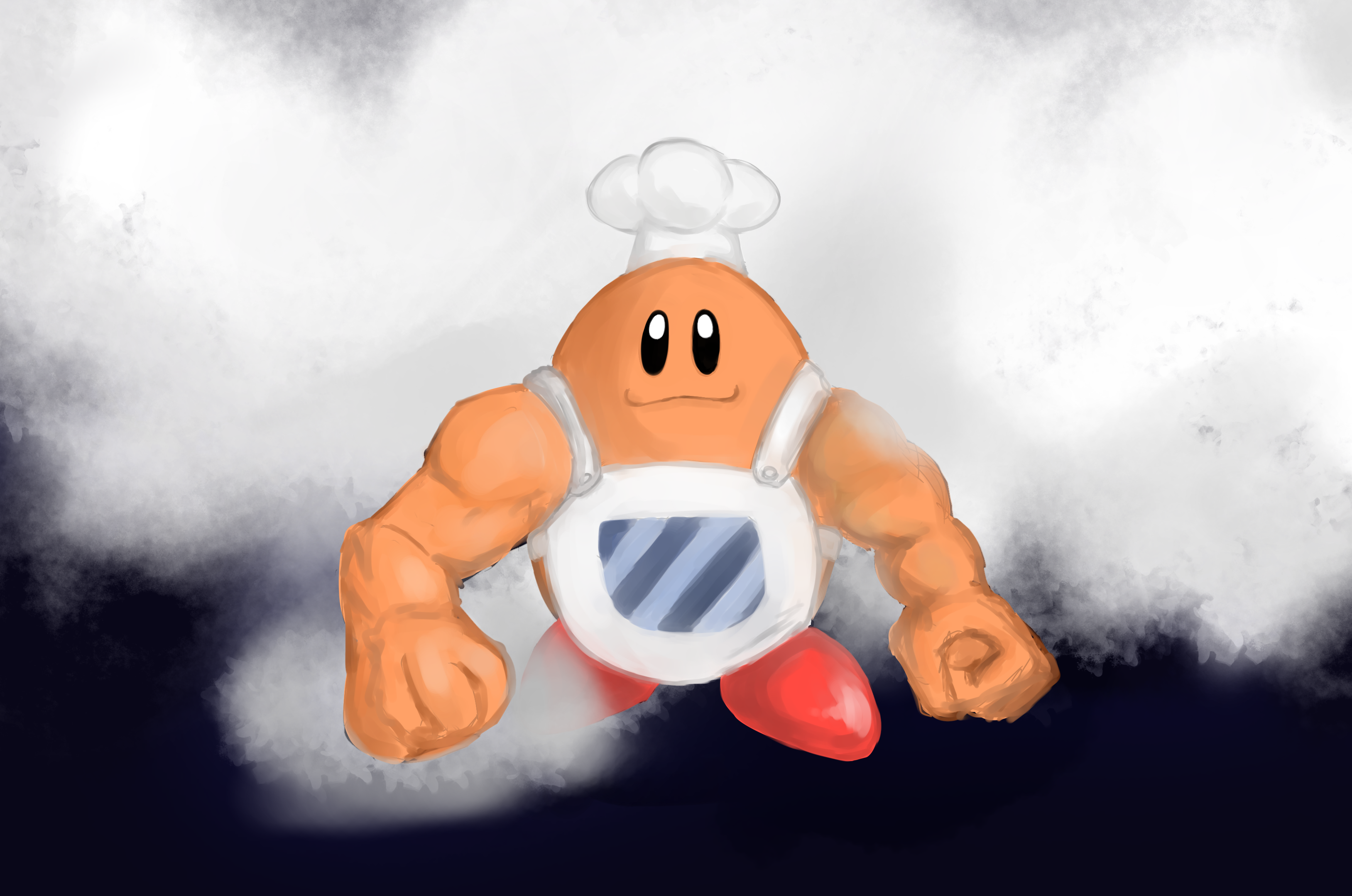 absurdres apron chef_hat chef_kawasaki clenched_hands closed_mouth facing_viewer hat highres kick_back_(song) kirby's_dream_land kirby_(series) muscular nintendo no_humans oversized_limbs scene_reference shoyu_nimono solo walking white_apron