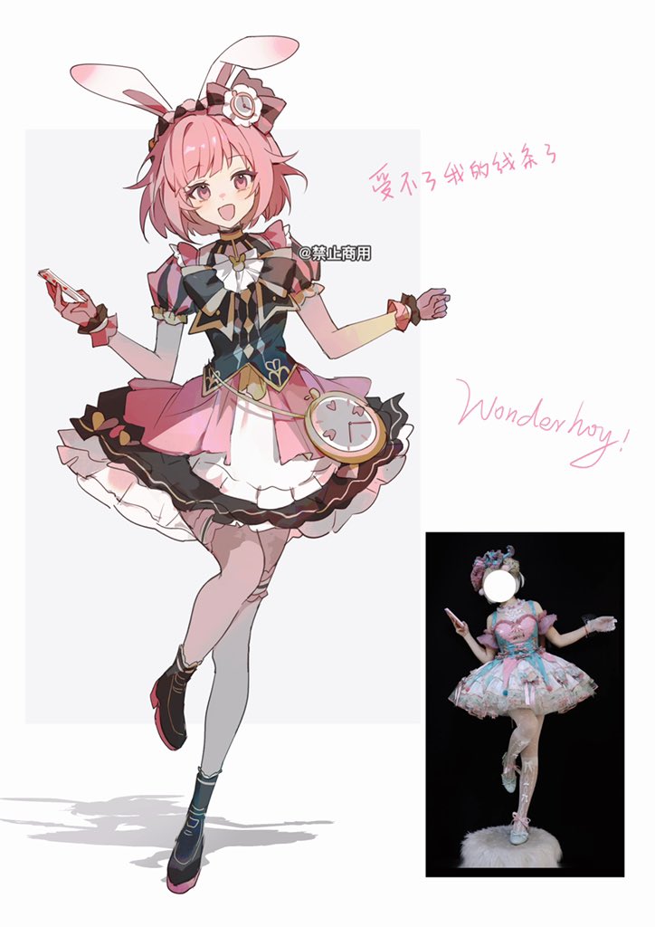 1girl :d animal_ears black_boots boots card clock clock_hair_ornament dress fake_animal_ears frilled_cuffs full_body gloves hisakawa_sora holding holding_card ootori_emu open_mouth pantyhose photo-referenced pink_dress pink_eyes pink_gloves pink_hair playing_card project_sekai rabbit_ears short_hair smile solo white_pantyhose wonder_magical_showtime!_(project_sekai)