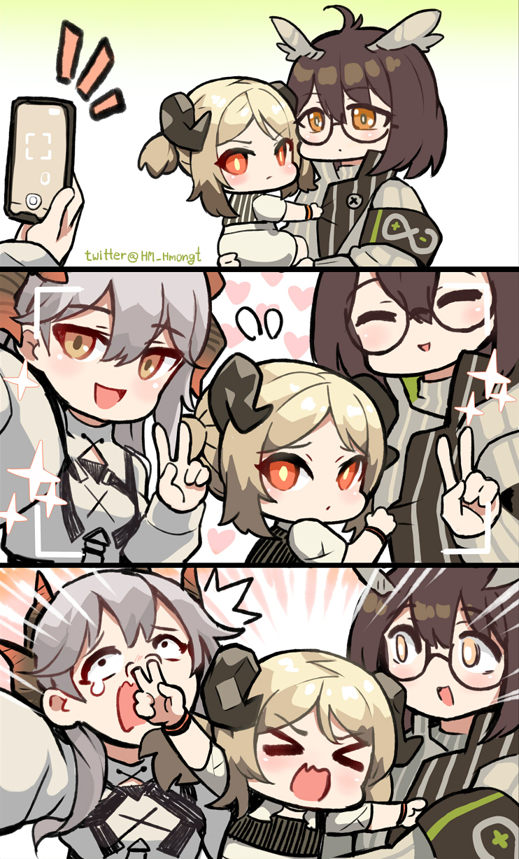 3girls 3koma arknights cellphone chibi comic demon_girl demon_horns dragon_girl dragon_horns finger_to_another's_nose highres hm_(hmongt) horns ifrit_(arknights) multiple_girls owl_ears owl_girl phone rhine_lab_(arknights) rhine_lab_family_(arknights) rhine_lab_logo saria_(arknights) selfie silence_(arknights) smartphone surprised v