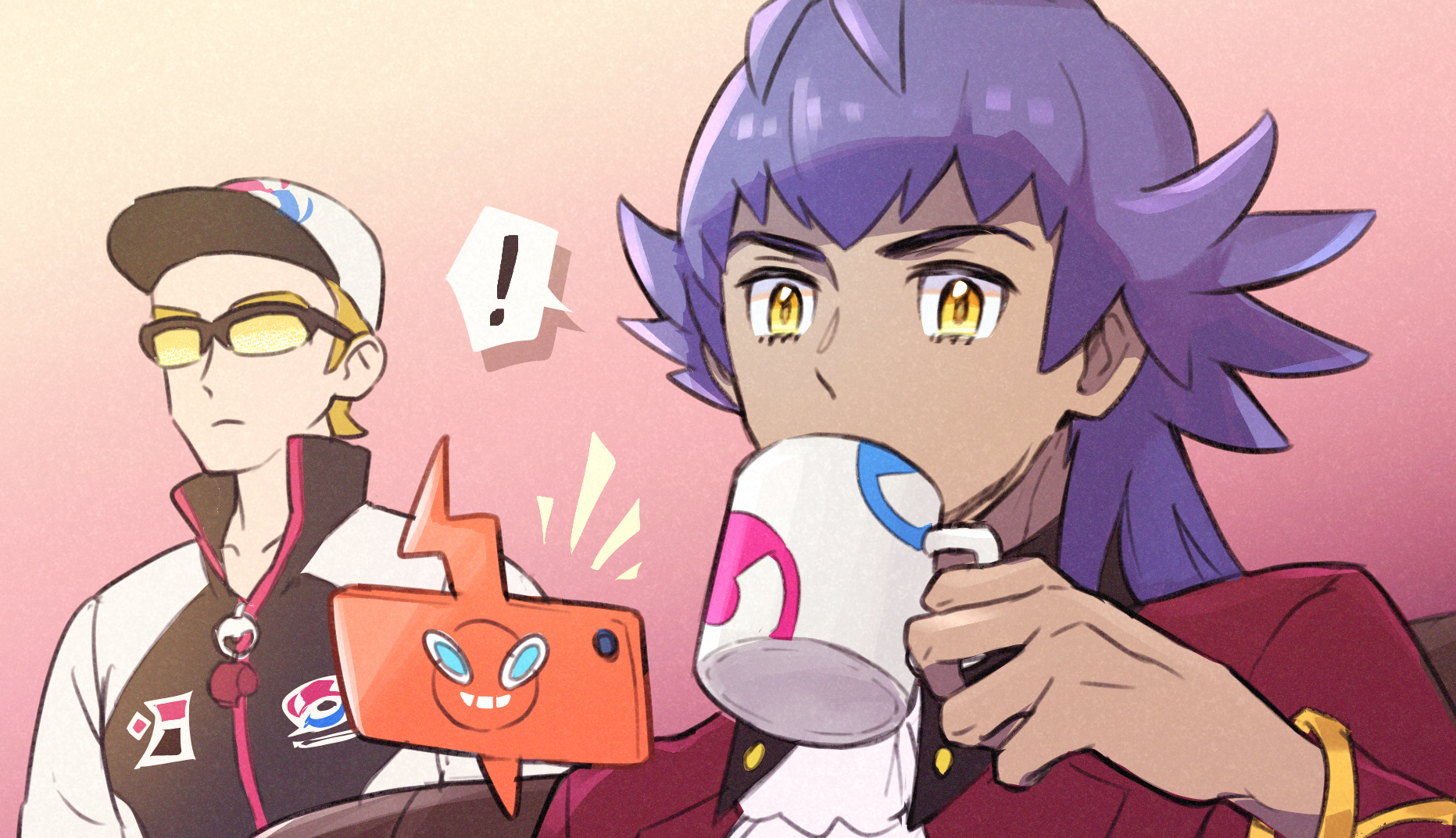 ! 2boys ascot baseball_cap blonde_hair buttons closed_mouth collarbone commentary_request cup dark-skinned_male dark_skin drinking facial_hair gen_4_pokemon gradient_background harai_(haraiqq) hat highres holding holding_cup jacket league_staff_(pokemon) leon_(pokemon) long_hair male_focus mug multiple_boys nintendo pokemon pokemon_sword_and_shield purple_hair red_jacket rotom rotom_phone spoken_exclamation_mark sunglasses whistle white_ascot white_headwear yellow_eyes zipper_pull_tab