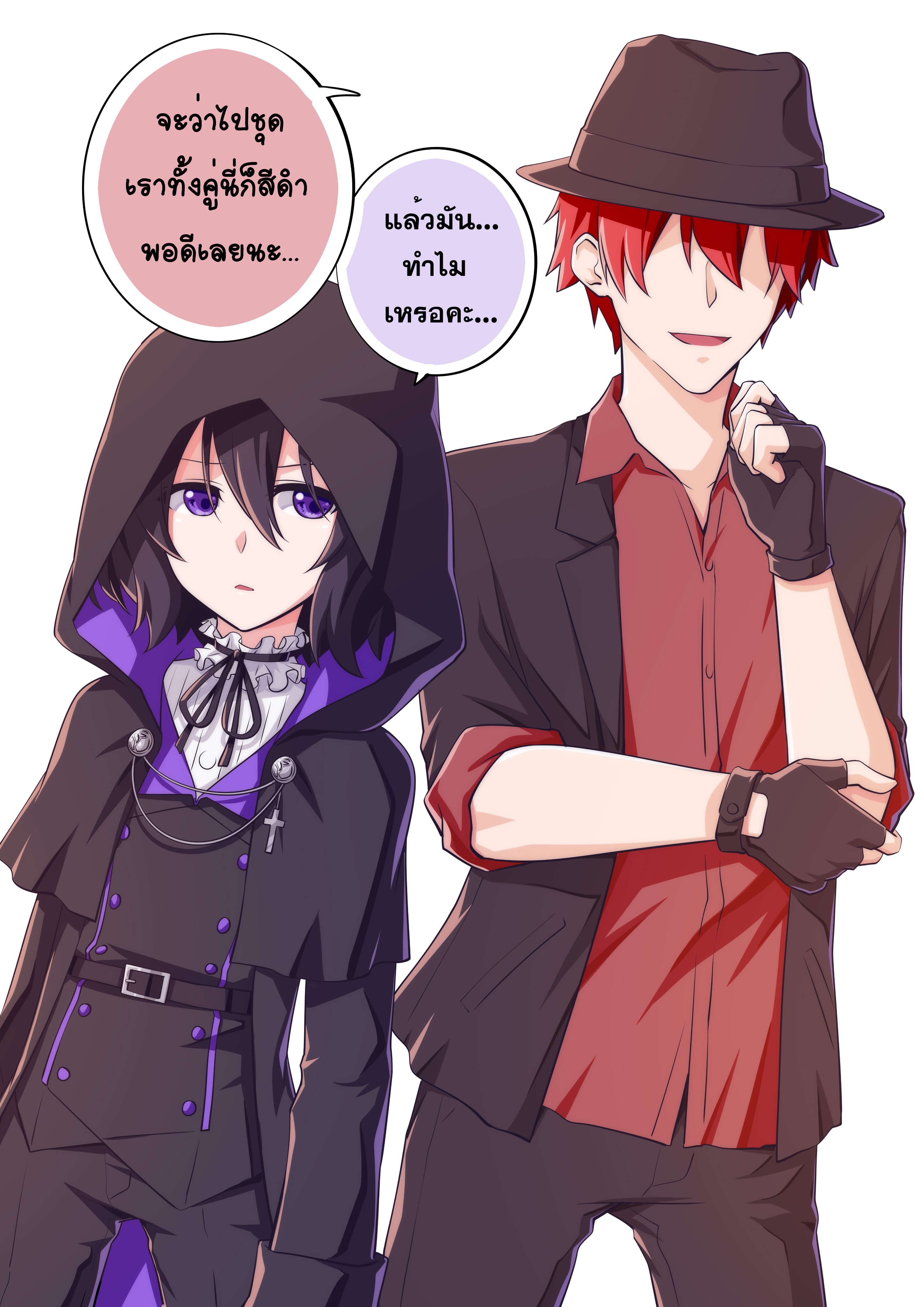 1boy 1girl absurdres belt black_hair black_hood black_jacket black_ribbon black_shirt brown_gloves brown_headwear brown_jacket brown_pants check_translation commentary fingerless_gloves gloves hair_between_eyes hat highres hood hood_up jacket levana_violette_(lusan666) long_sleeves lusan666 machine-translated neck_ribbon no_eyes open_mouth original pants purple_eyes red_hair red_shirt ribbon shirt untranslatable_commentary thai_text translation_request white_background