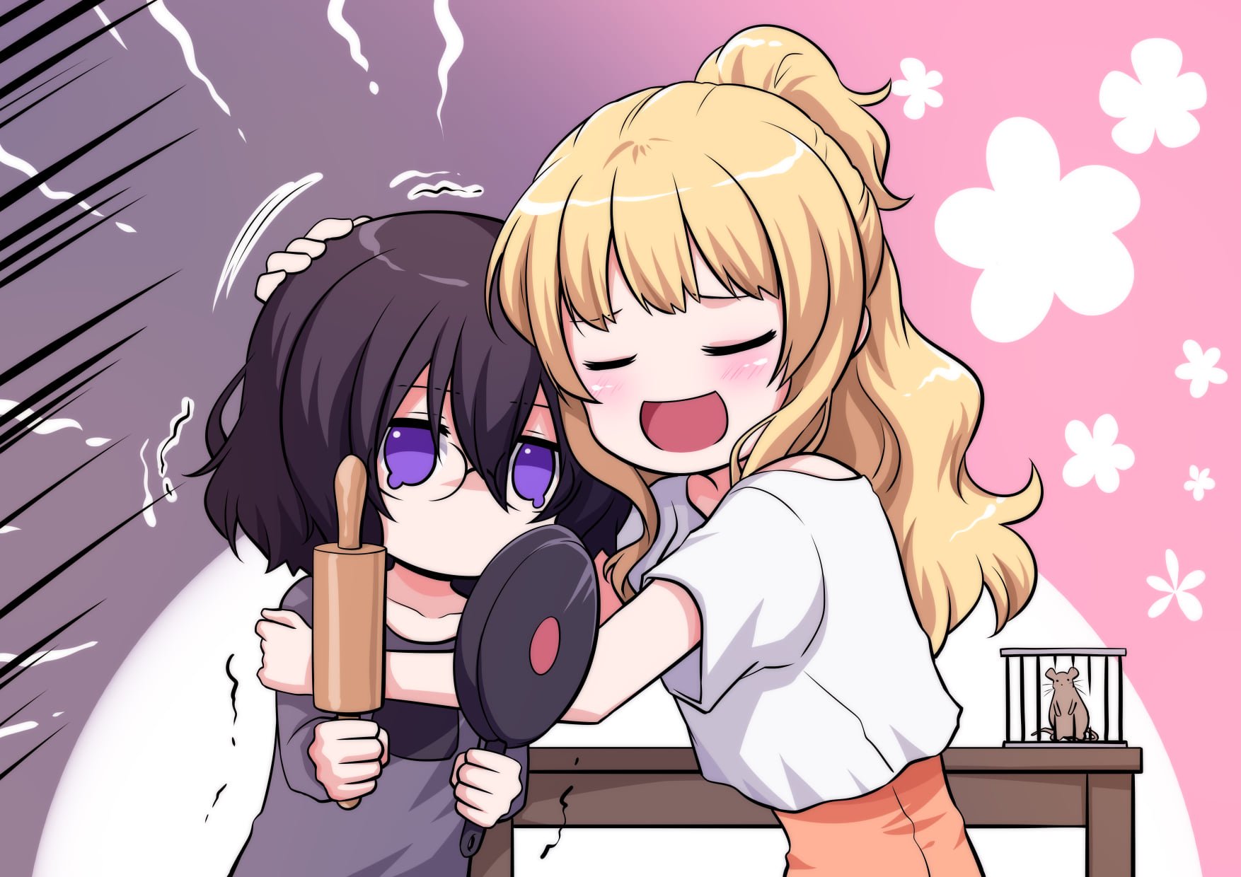 2girls animal black_hair blonde_hair cage closed_eyes frying_pan grey_shirt highres holding holding_frying_pan kateil_(lusan666) levana_violette_(lusan666) long_sleeves lusan666 mouse_(animal) multiple_girls open_mouth orange_skirt original purple_eyes rolling_pin shirt short_hair short_sleeves skirt table white_shirt