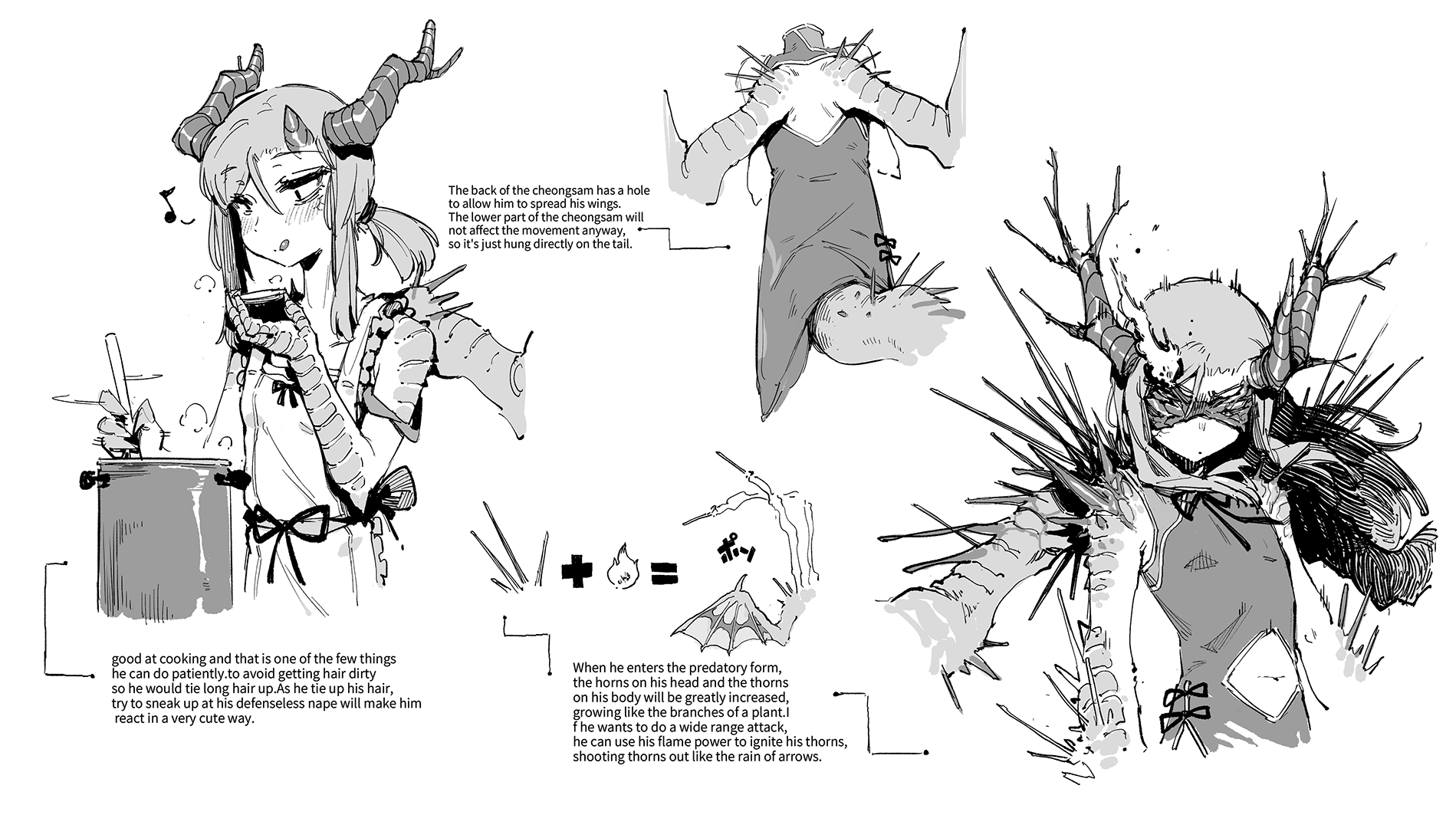 1boy :p apron bags_under_eyes reference_sheet china_dress chinese_clothes clothing_cutout cooking dragon_boy dragon_horns dragon_tail dragon_wings dress english_text greyscale hatching_(texture) highres horns kaiju_girls karasu_raven lim_(kaiju_girls) male_focus monochrome monster_boy navel_cutout ponytail second-party_source solo tail tongue tongue_out trap wings
