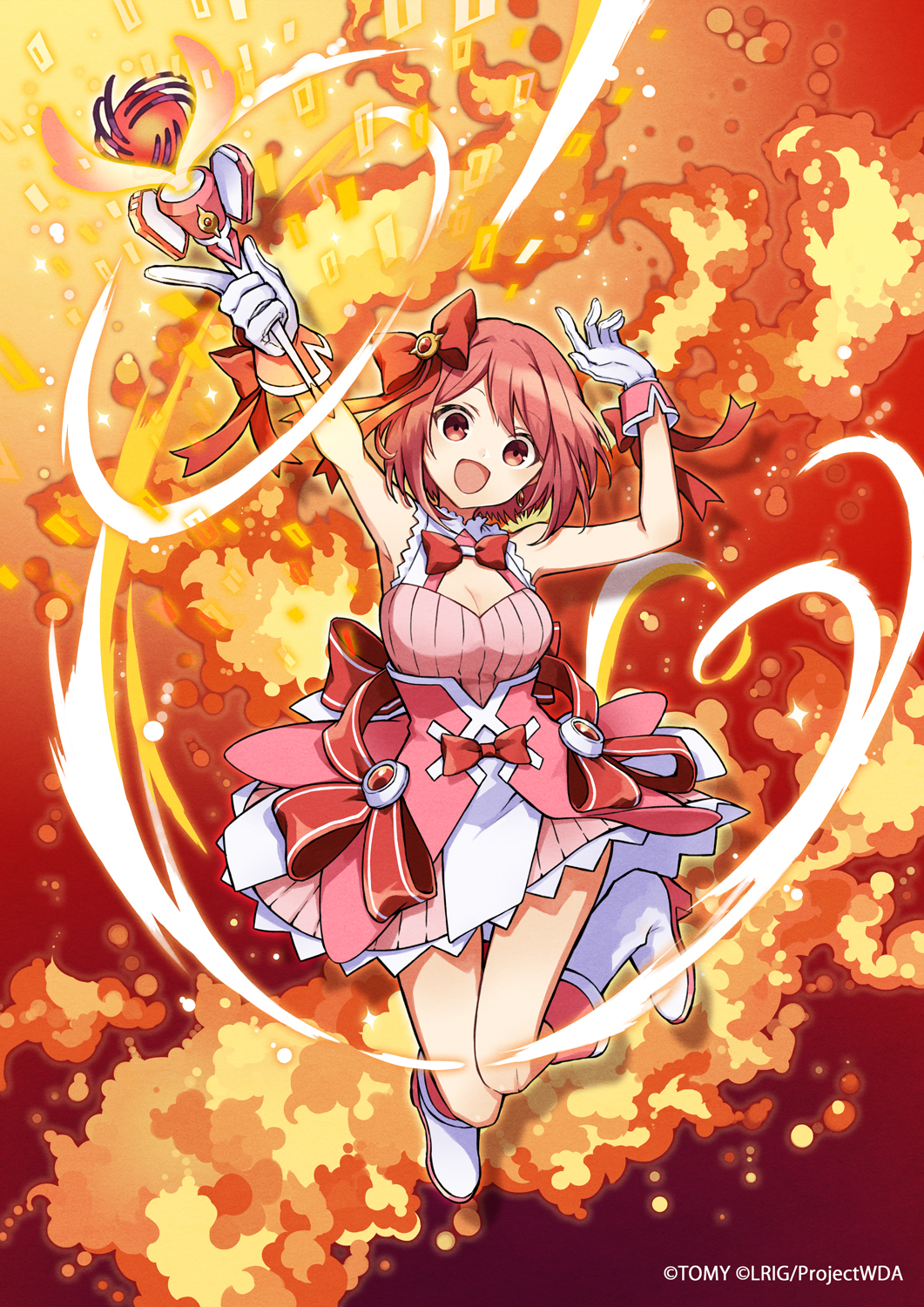 1girl :d arms_up boots bow breasts buzz_(moi) cleavage copyright_notice dress dress_bow fire full_body glove_bow hair_bow head_tilt highres holding holding_wand knees_together_feet_apart legs_up magical_girl medium_breasts official_art open_mouth orange_theme outstretched_arm overskirt pink_dress pink_hair red_background red_bow red_eyes short_hair sleeveless sleeveless_dress smile solo swept_bangs wand white_boots wixoss wixoss_diva(a)live