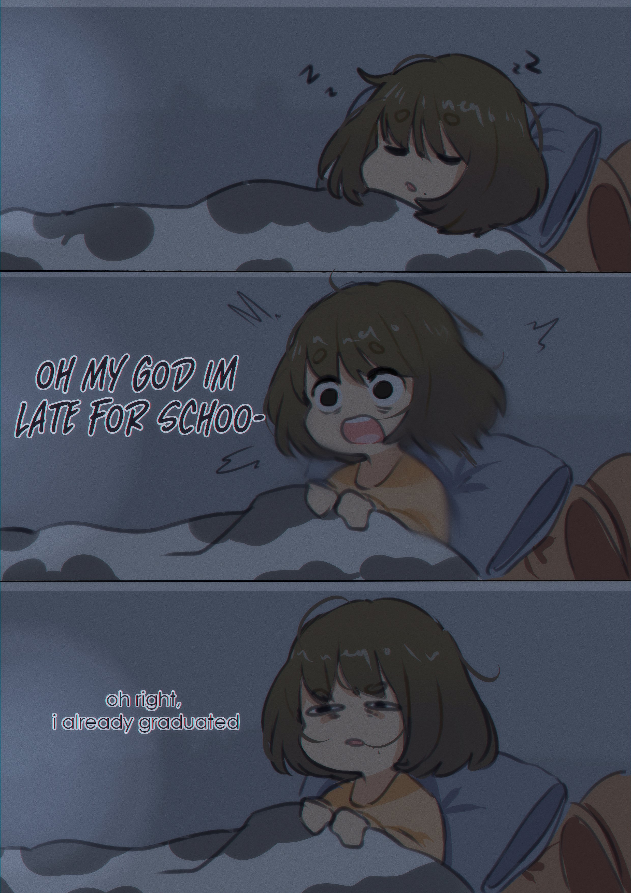 1girl 3koma absurdres closed_eyes comic creator_(neneneqo) english_text female_focus highres indoors motion_blur motion_lines neqo_(neneneqo) open_mouth original pillow sleeping solo squinting truth under_covers waking_up wide-eyed worried zzz