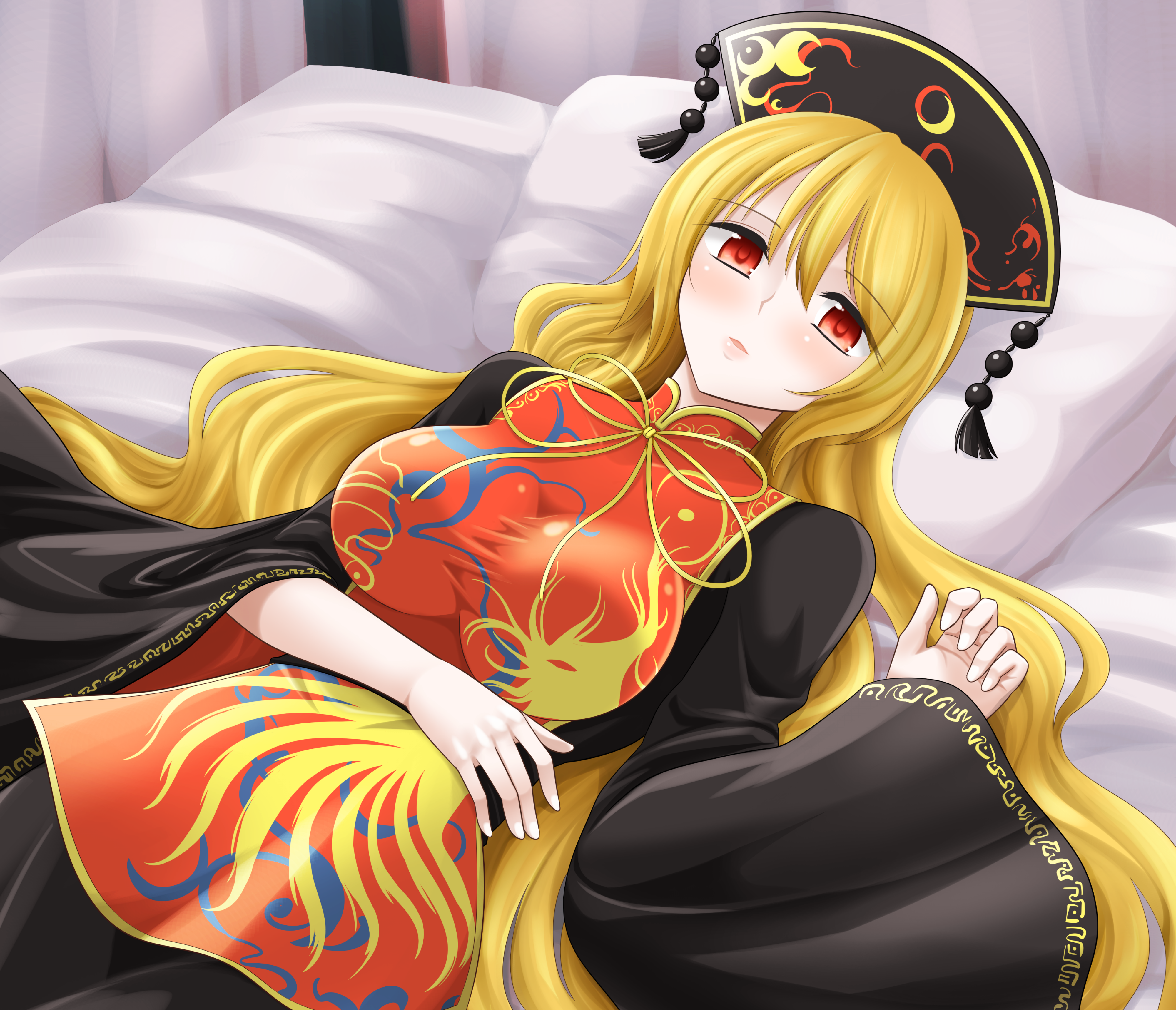 1girl absurdres animal_print bed belt bird_print black_belt black_dress black_hat blonde_hair blush bow bowtie breasts chinese_clothes commentary_request crescent crescent_print dress hair_between_eyes hands_up hat highres hisin indoors junko_(touhou) large_breasts long_hair long_sleeves looking_at_viewer lying mandarin_collar on_back open_mouth phoenix_crown phoenix_print pillow pom_pom_(clothes) red_eyes red_tabard smile solo tabard touhou wall wavy_hair wide_sleeves yellow_bow yellow_bowtie