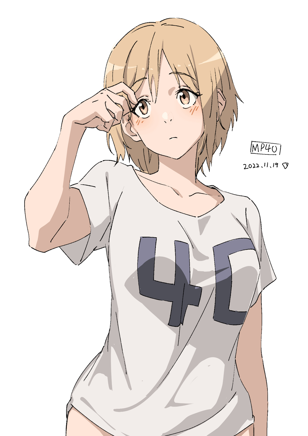 1girl alternate_costume blonde_hair brown_eyes dated expressionless girls'_frontline hand_on_own_face highres holding holding_own_hair mp40_(girls'_frontline) shadow shirt short_hair short_sleeves sketch solo thighs triangle_bullet white_background white_shirt