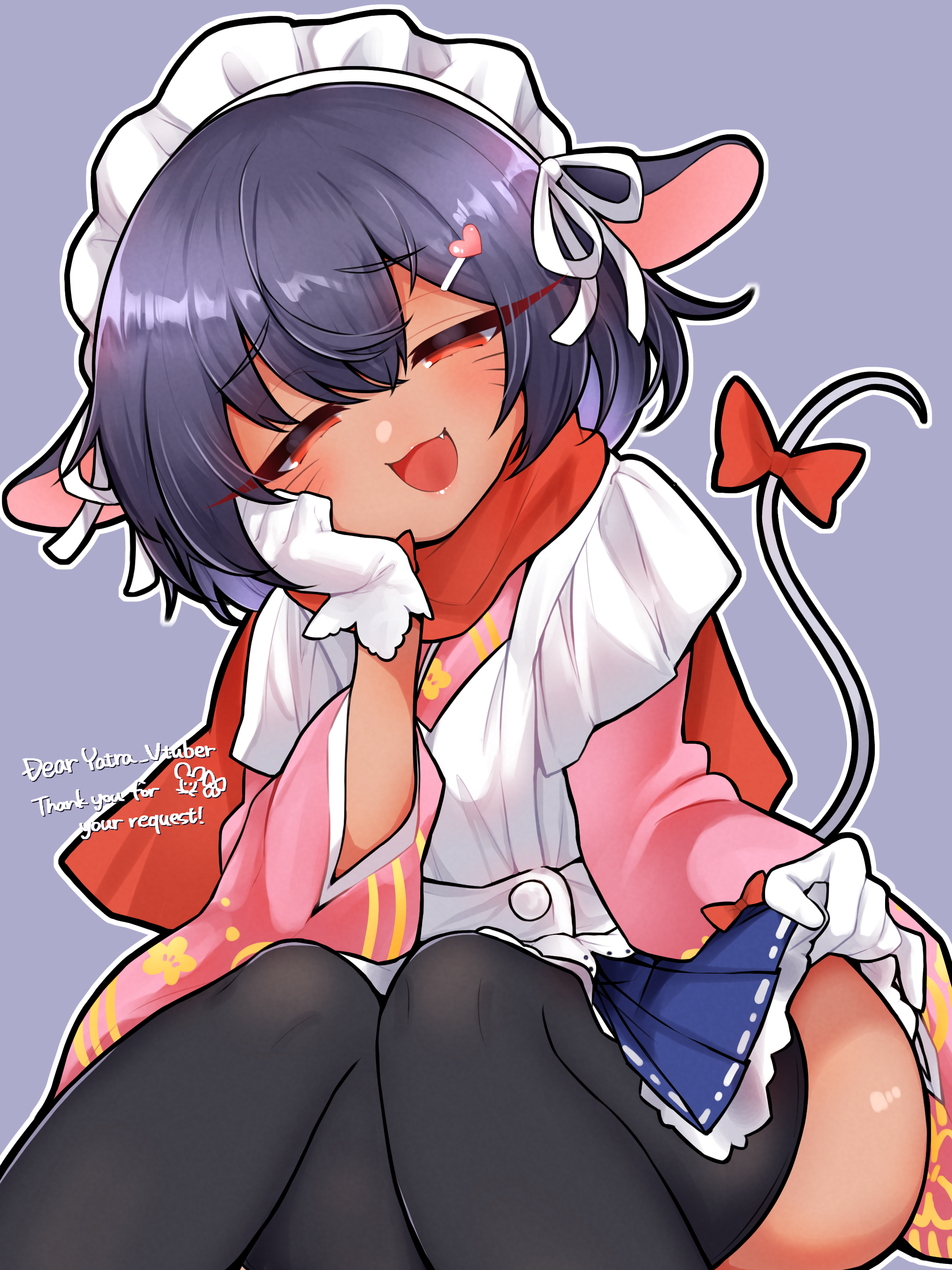 1girl absurdres animal_ears apron bow commission dark_skin facial_mark hair_ornament hairclip hand_on_own_cheek hand_on_own_face highres indie_virtual_youtuber long_sleeves looking_at_viewer maid_headdress mouse_ears mouse_girl mouse_tail open_mouth pleated_skirt purple_hair red_eyes resolution_mismatch ribbon scarf short_hair simple_background skeb_commission skirt smug solo source_smaller tail thighhighs virtual_youtuber yatra_(vtuber)