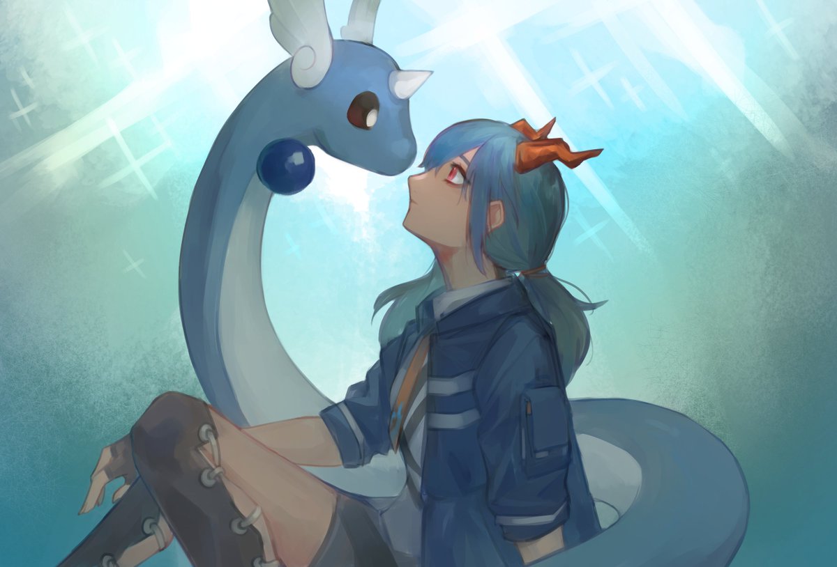 1girl arknights bad_id bad_twitter_id black_shorts blue_hair ch'en_(arknights) commentary crossover dragonair gen_1_pokemon haqlue horns jacket necktie nintendo pokemon pokemon_(creature) red_eyes shirt shorts white_shirt