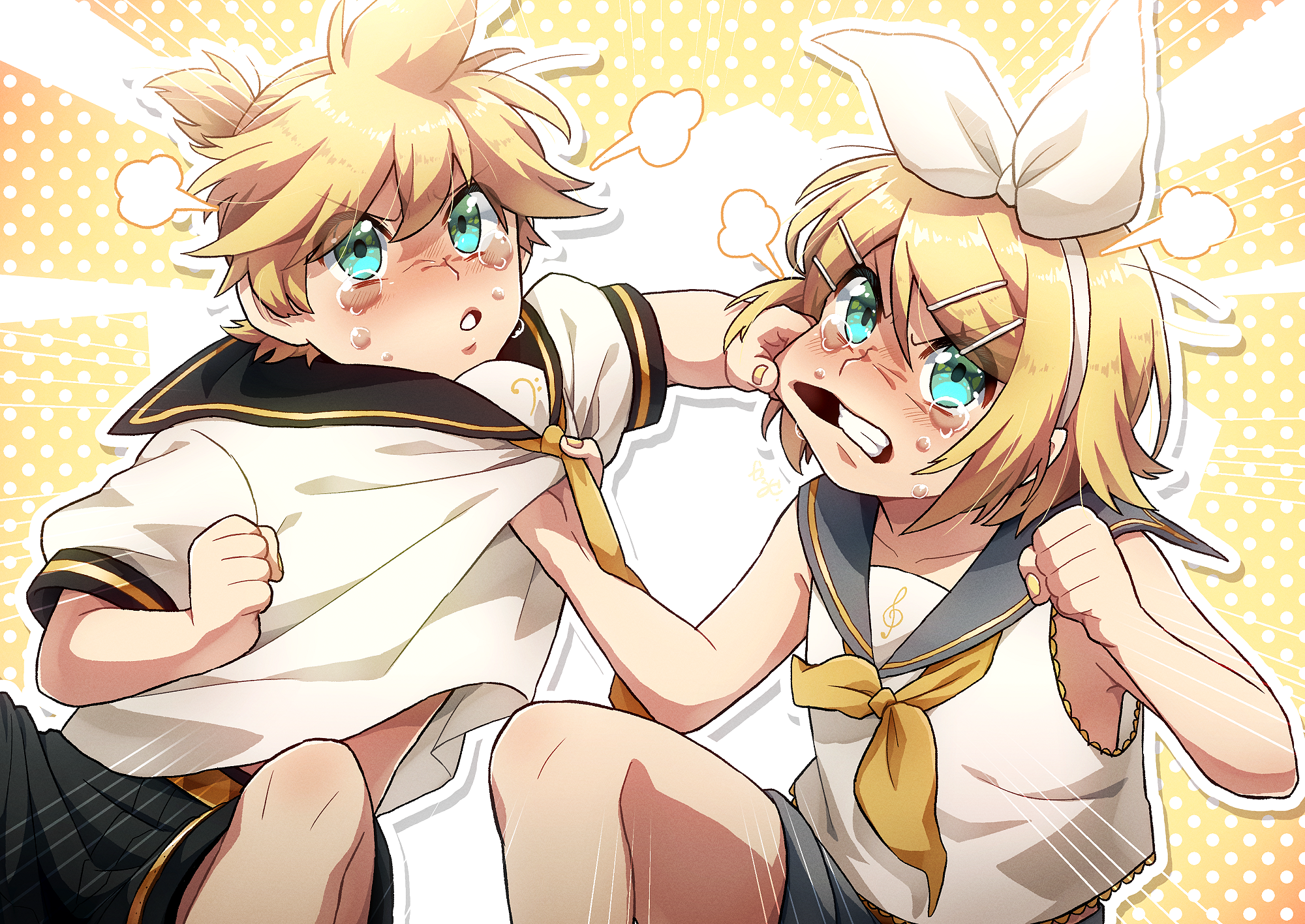 1boy 1girl angry aqua_eyes bass_clef blonde_hair bow brother_and_sister can't_choose_your_own_family cheek_pinching cheek_pull clenched_hand clenched_teeth clothes_grab crying crying_with_eyes_open fighting flat_chest frown fume hair_bow hair_ornament hairclip hand_on_another's_cheek hand_on_another's_face head_steam highres kagamine_len kagamine_rin looking_at_viewer neckerchief necktie pinching ponytail sailor_collar sailor_shirt scowl shirt grabbing_another's_shirt short_ponytail shorts siblings sleeveless sleeveless_shirt streaming_tears tears teeth treble_clef twins vocaloid white_bow yaruse_nai_(minri) yellow_neckerchief yellow_necktie