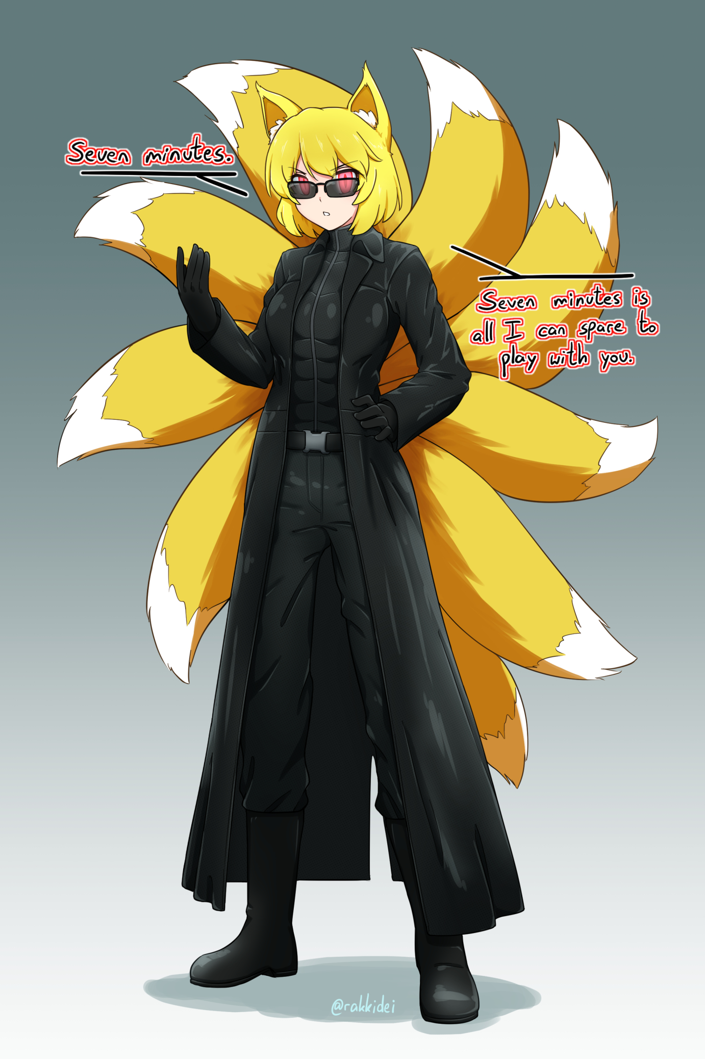 1girl albert_wesker albert_wesker_(cosplay) black_boots black_coat blonde_hair boots coat commentary commission cosplay english_commentary english_text fox_girl fox_tail full_body gradient_background grey_background hand_in_pocket highres kitsune looking_at_viewer multiple_tails open_mouth rakkidei red_eyes resident_evil resident_evil_5 short_hair solo standing sunglasses tail touhou twitter_username yakumo_ran