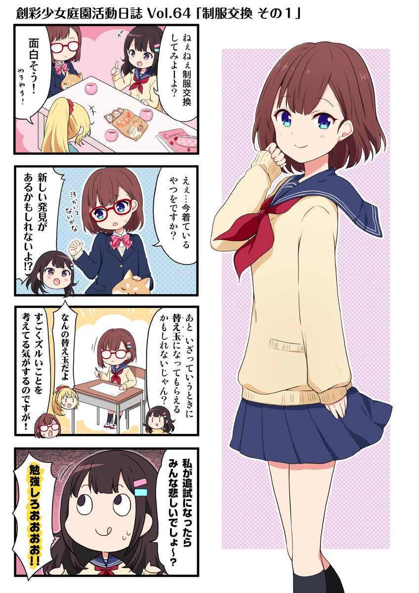 3girls asymmetrical_bangs black_socks blazer blonde_hair blue_eyes blue_jacket blue_sailor_collar blue_skirt blush bow bowtie brown_hair chair chibi chibi_inset coffee_table collared_shirt comic cosplay cup desk dog food glasses green_jacket hair_ornament hairclip highres holding holding_pencil index_finger_raised jacket long_hair long_sleeves looking_at_viewer motion_lines multiple_girls neckerchief notebook official_art opaque_glasses open_mouth pencil pencil_case petting pleated_skirt ponytail purple_eyes ragho_no_erika red-framed_eyewear red_bow red_bowtie red_neckerchief saeki_ritsuka sailor_collar school_chair school_desk school_uniform shirt short_hair shrugging sitting skirt sleeves_past_wrists smile socks sousai_shoujo_teien sweatdrop sweater table takanashi_koyomi teacup thighs tongue tongue_out v-neck white_shirt yuki_madoka
