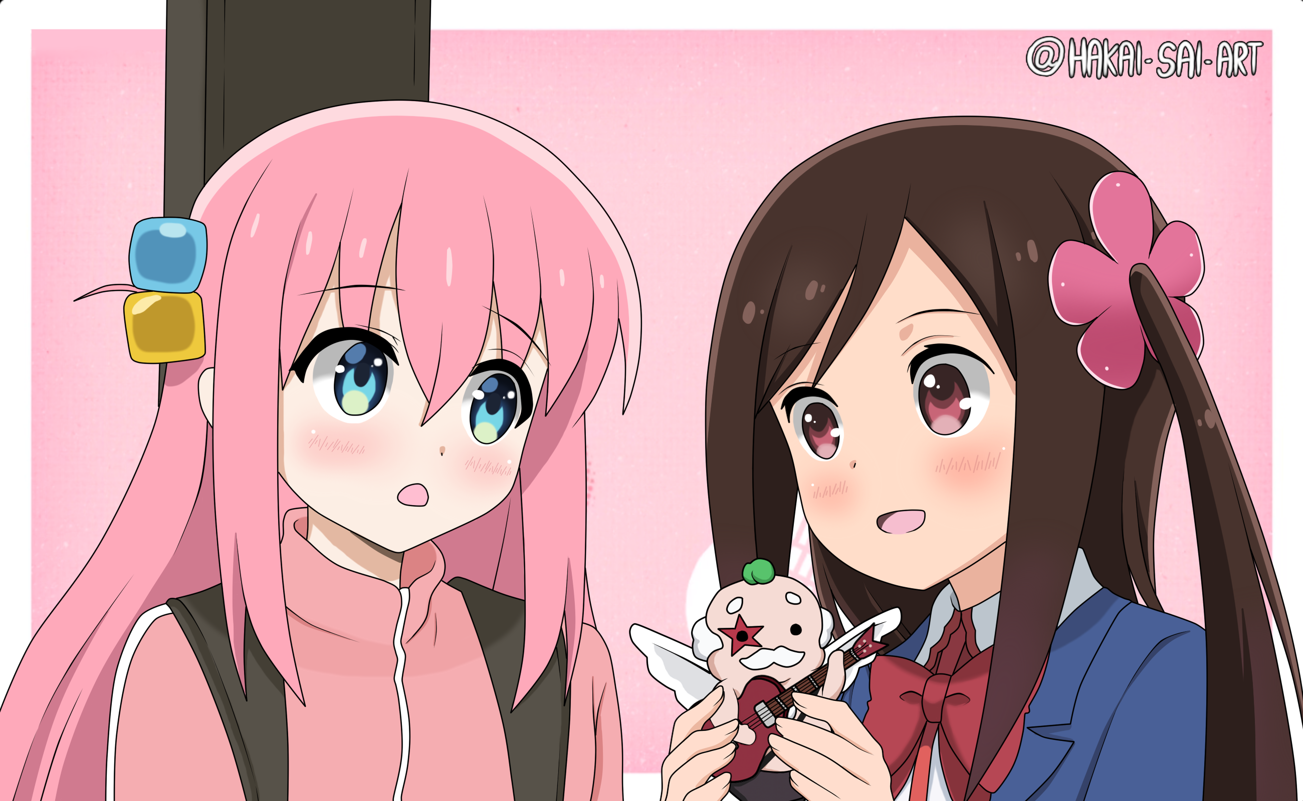 2girls artist_name blue_cardigan blue_eyes blush bocchi_the_rock! bow bowtie brown_hair cardigan commentary crossover english_commentary flower gotoh_hitori hair_flower hair_ornament hakaisaiart highres hitori_bocchi hitoribocchi_no_marumaru_seikatsu instrument_case long_hair multiple_girls name_connection pink_background pink_hair pink_track_suit portrait red_bow red_eyes side_ponytail track_suit trait_connection