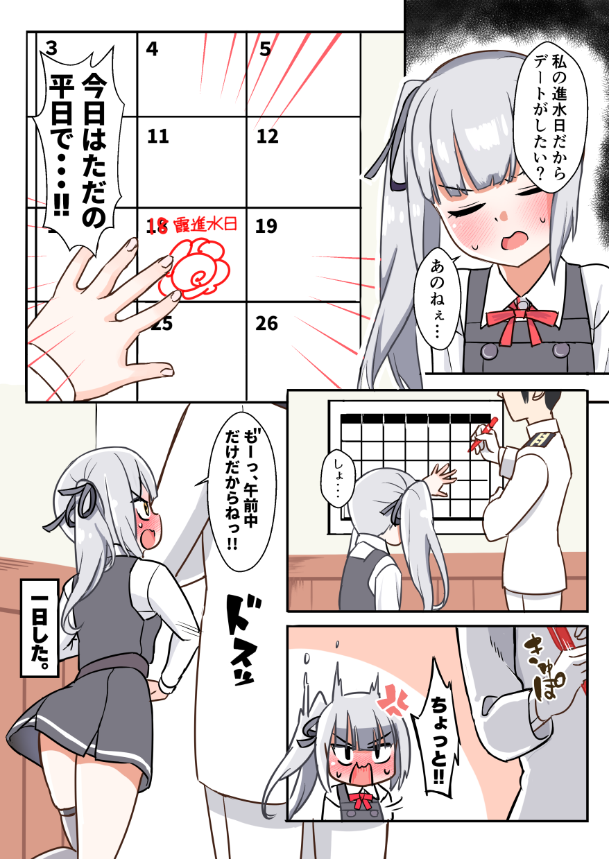 1boy 1girl admiral_(kancolle) black_ribbon brown_eyes calendar_(object) dress grey_hair hair_ribbon highres kantai_collection kasumi_(kancolle) kasumi_kai_ni_(kancolle) long_hair long_sleeves pinafore_dress red_ribbon ribbon school_uniform shirt side_ponytail sleeveless sleeveless_dress speech_bubble sun_fle translation_request white_shirt