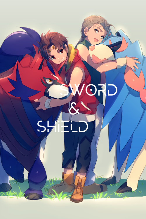 2boys brown_eyes brown_hair circlet commentary_request copyright_name crossover echo_(circa) full_body gen_8_pokemon gensou_suikoden gensou_suikoden_ii jowy_atreides-blight legendary_pokemon male_focus multiple_boys nintendo open_mouth pokemon pokemon_(creature) riou_(suikoden) smile zacian zacian_(hero) zamazenta zamazenta_(hero)