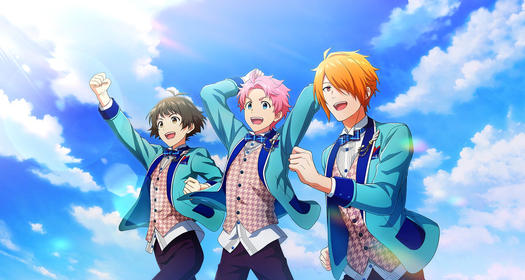 3boys ahoge akizuki_ryo blue_eyes blue_sky bow bowtie brown_eyes brown_hair clenched_hands f-lags_(idolmaster) fingernails hair_over_one_eye highres idolmaster idolmaster_side-m idolmaster_side-m_growing_stars kabuto_daigo long_sleeves male_focus multiple_boys official_art orange_hair pink_hair running sky smile teeth tsukumo_kazuki undershirt