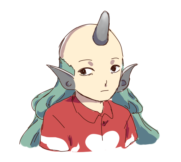 1girl arumimangotroid bald bald_female cloud_print hidden_star_in_four_seasons horns komano_aunn parody red_shirt shirt single_horn touhou