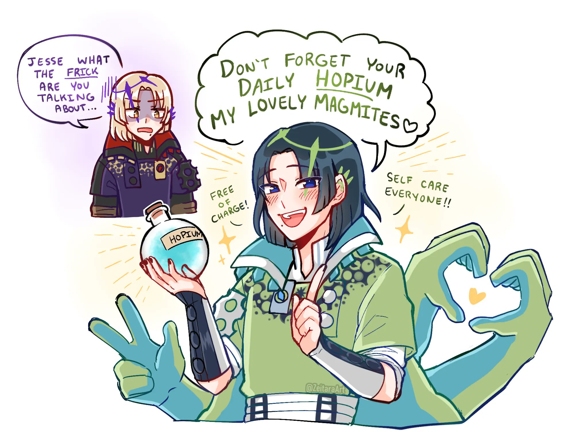 blonde_hair dual_persona ear_piercing english_text extra_arms green_shirt heart heart_hands highres holostars holostars_english long_hair magni_dezmond mole mole_under_mouth multicolored_hair multiple_boys piercing purple_shirt shirt short_hair smile streaked_hair tunic vial virtual_youtuber yellow_eyes zeitaraart